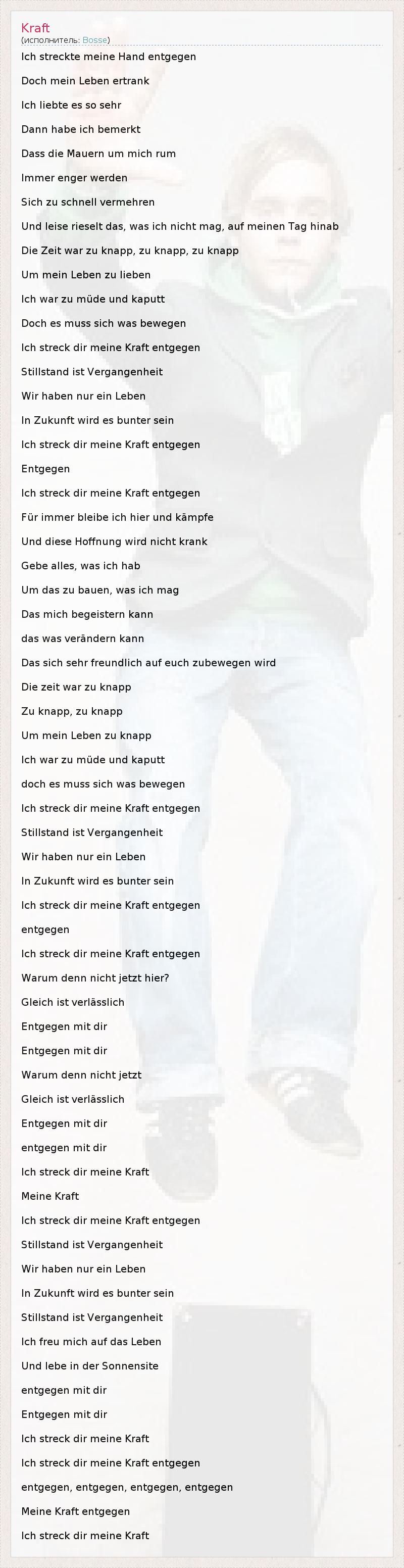 Ich streckte meine Hand entgegen Doch mein Leben ertrank Ich liebte es so sehr Dann habe ich bemerkt Dass die Mauern um mich rum Immer enger werden Sich zu schnell vermehren Und leise rieselt das, was ich nicht mag, auf meinen Tag hinab Die Zeit war zu knapp, zu knapp, zu knapp Um mein Leben zu lieben Ich war zu müde und kaputt Doch es muss sich was bewegen Ich streck dir meine Kraft entgegen Stillstand ist Vergangenheit Wir haben nur ein Leben In Zukunft wird es bunter sein Ich streck dir meine Kraft entgegen Entgegen Ich streck dir meine Kraft entgegen Für immer bleibe ich hier und kämpfe Und diese Hoffnung wird nicht krank Gebe alles, was ich hab Um das zu bauen, was ich mag Das mich begeistern kann das was verändern kann Das sich sehr freundlich auf euch zubewegen wird Die zeit war zu knapp Zu knapp, zu knapp Um mein Leben zu knapp Ich war zu müde und kaputt doch es muss sich was bewegen Ich streck dir meine Kraft entgegen Stillstand ist Vergangenheit Wir haben nur ein Leben In Zukunft wird es bunter sein Ich streck dir meine Kraft entgegen entgegen Ich streck dir meine Kraft entgegen Warum denn nicht jetzt hier? Gleich ist verlässlich Entgegen mit dir Entgegen mit dir Warum denn nicht jetzt Gleich ist verlässlich Entgegen mit dir entgegen mit dir Ich streck dir meine Kraft Meine Kraft Ich streck dir meine Kraft entgegen Stillstand ist Vergangenheit Wir haben nur ein Leben In Zukunft wird es bunter sein Stillstand ist Vergangenheit Ich freu mich auf das Leben Und lebe in der Sonnensite entgegen mit dir Entgegen mit dir Ich streck dir meine Kraft Ich streck dir meine Kraft entgegen entgegen, entgegen, entgegen, entgegen Meine Kraft entgegen Ich streck dir meine Kraft