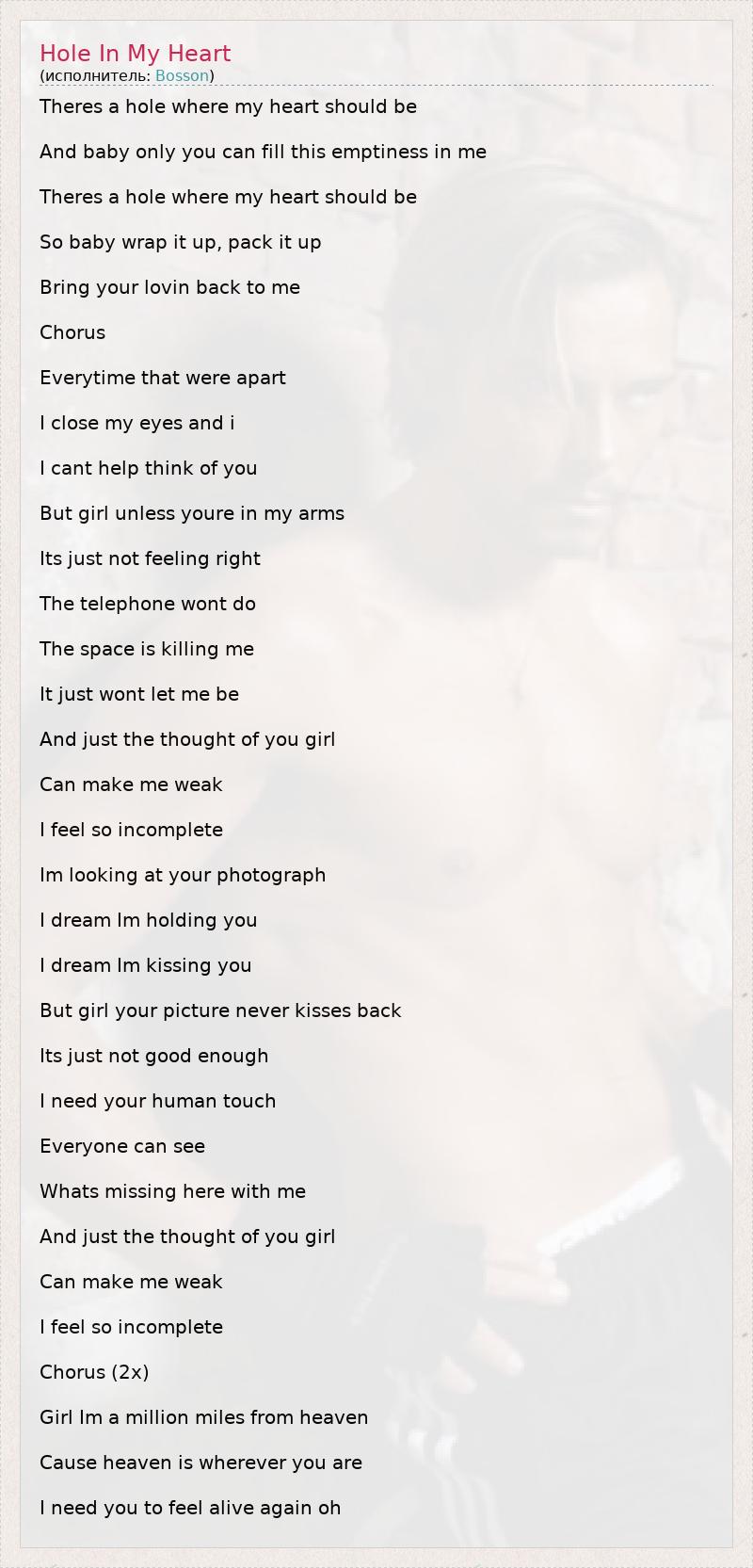 Theres a hole where my heart should be And baby only you can fill this emptiness in me Theres a hole where my heart should be So baby wrap it up, pack it up Bring your lovin back to me Chorus Everytime that were apart I close my eyes and i I cant help think of you But girl unless youre in my arms Its just not feeling right The telephone wont do The space is killing me It just wont let me be And just the thought of you girl Can make me weak I feel so incomplete Im looking at your photograph I dream Im holding you I dream Im kissing you But girl your picture never kisses back Its just not good enough I need your human touch Everyone can see Whats missing here with me And just the thought of you girl Can make me weak I feel so incomplete Chorus (2x) Girl Im a million miles from heaven Cause heaven is wherever you are I need you to feel alive again oh