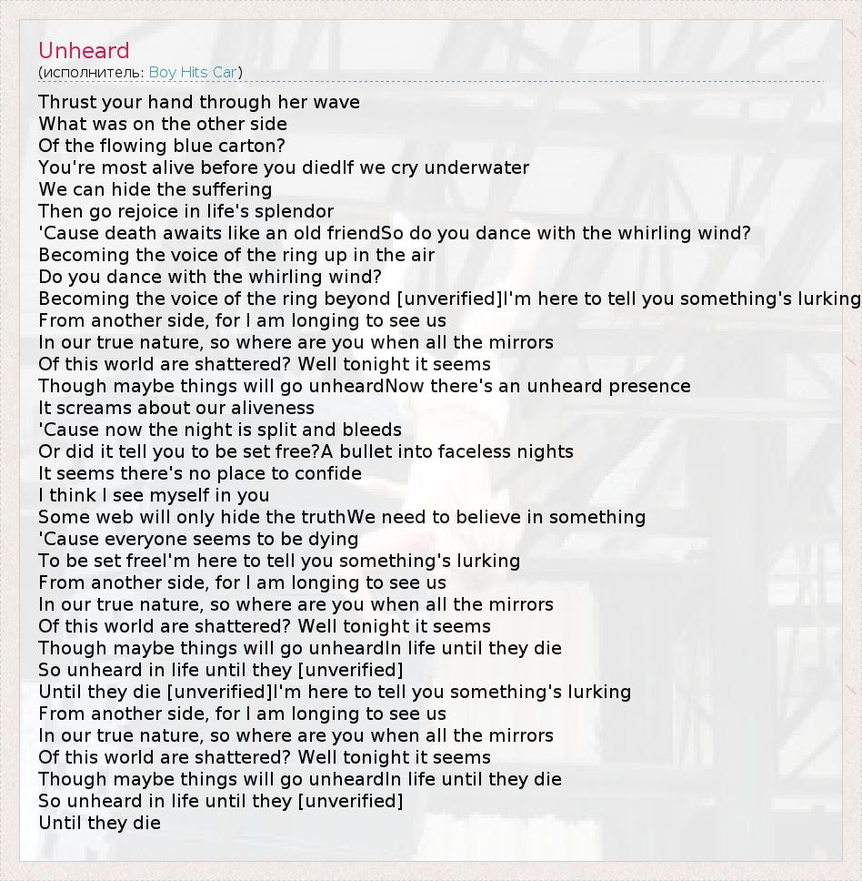 Thrust your hand through her wave What was on the other side Of the flowing blue carton? You're most alive before you diedIf we cry underwater We can hide the suffering Then go rejoice in life's splendor 'Cause death awaits like an old friendSo do you dance with the whirling wind? Becoming the voice of the ring up in the air Do you dance with the whirling wind? Becoming the voice of the ring beyond [unverified]I'm here to tell you something's lurking From another side, for I am longing to see us In our true nature, so where are you when all the mirrors Of this world are shattered? Well tonight it seems Though maybe things will go unheardNow there's an unheard presence It screams about our aliveness 'Cause now the night is split and bleeds Or did it tell you to be set free?A bullet into faceless nights It seems there's no place to confide I think I see myself in you Some web will only hide the truthWe need to believe in something 'Cause everyone seems to be dying To be set freeI'm here to tell you something's lurking From another side, for I am longing to see us In our true nature, so where are you when all the mirrors Of this world are shattered? Well tonight it seems Though maybe things will go unheardIn life until they die So unheard in life until they [unverified] Until they die [unverified]I'm here to tell you something's lurking From another side, for I am longing to see us In our true nature, so where are you when all the mirrors Of this world are shattered? Well tonight it seems Though maybe things will go unheardIn life until they die So unheard in life until they [unverified] Until they die