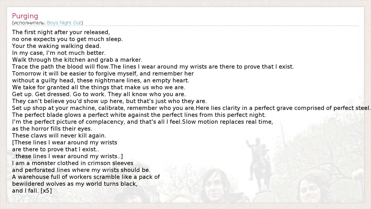 Это интересно:Группа «Boys Night Out» была сформирована вокалистом Connor Lovat-Fraser и гитаристом Jeff Davis в 2001 году, в Берлингтоне, Онтарио. Первой записью коллектива стало четырех-трековое демо «You Are My Canvas», в звучании которого была ярко выражена стилистика земляков – hardcore punk формации «Grade». Данная запись помогла музыкантам прописаться на лэйбле «One Day Savior Records», через который и был выпущен первый официальный релиз... продолжение