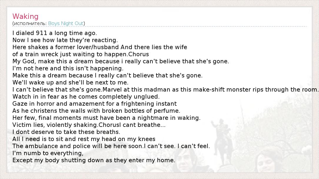 Это интересно:Группа «Boys Night Out» была сформирована вокалистом Connor Lovat-Fraser и гитаристом Jeff Davis в 2001 году, в Берлингтоне, Онтарио. Первой записью коллектива стало четырех-трековое демо «You Are My Canvas», в звучании которого была ярко выражена стилистика земляков – hardcore punk формации «Grade». Данная запись помогла музыкантам прописаться на лэйбле «One Day Savior Records», через который и был выпущен первый официальный релиз... продолжение