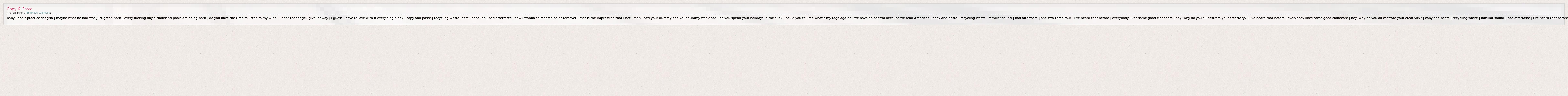 baby I don't practice sangria | maybe what he had was just green horn | every fucking day a thousand pools are being born | do you have the time to listen to my wine | under the fridge I give it away | I guess I have to love with it every single day | copy and paste | recycling waste | familiar sound | bad aftertaste | now I wanna sniff some paint remover | that is the impression that I bet | man I saw your dummy and your dummy was dead | do you spend your holidays in the sun? | could you tell me what's my rage again? | we have no control because we read American | copy and paste | recycling waste | familiar sound | bad aftertaste | one-two-three-four | I've heard that before | everybody likes some good clonecore | hey, why do you all castrate your creativity? | I've heard that before | everybody likes some good clonecore | hey, why do you all castrate your creativity? | copy and paste | recycling waste | familiar sound | bad aftertaste | I've heard that before