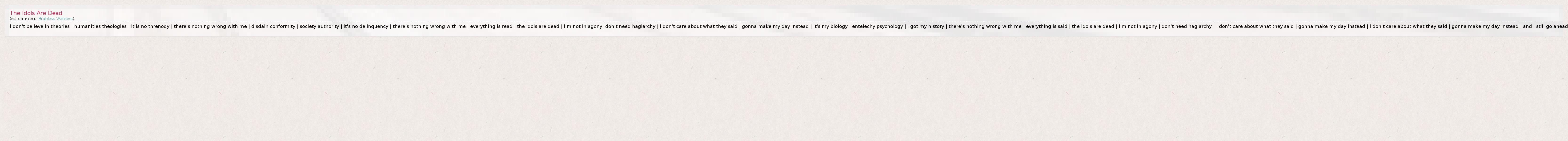 I don't believe in theories | humanities theologies | it is no threnody | there's nothing wrong with me | disdain conformity | society authority | it's no delinquency | there's nothing wrong with me | everything is read | the idols are dead | I'm not in agony| don't need hagiarchy | I don't care about what they said | gonna make my day instead | it's my biology | entelechy psychology | I got my history | there's nothing wrong with me | everything is said | the idols are dead | I'm not in agony | don't need hagiarchy | I don't care about what they said | gonna make my day instead | I don't care about what they said | gonna make my day instead | and I still go ahead