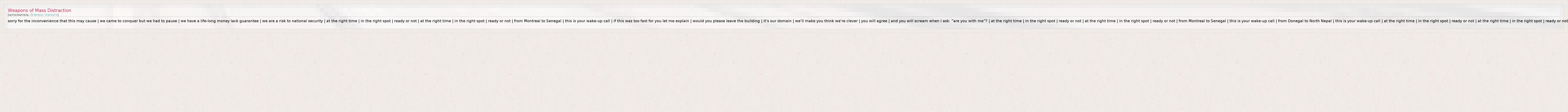 sorry for the inconvenience that this may cause | we came to conquer but we had to pause | we have a life-long money lack guarantee | we are a risk to national security | at the right time | in the right spot | ready or not | at the right time | in the right spot | ready or not | from Montreal to Senegal | this is your wake-up call | if this was too fast for you let me explain | would you please leave the building | it's our domain | we'll make you think we're clever | you will agree | and you will scream when I ask: "are you with me"? | at the right time | in the right spot | ready or not | at the right time | in the right spot | ready or not | from Montreal to Senegal | this is your wake-up call | from Donegal to North Nepal | this is your wake-up call | at the right time | in the right spot | ready or not | at the right time | in the right spot | ready or not