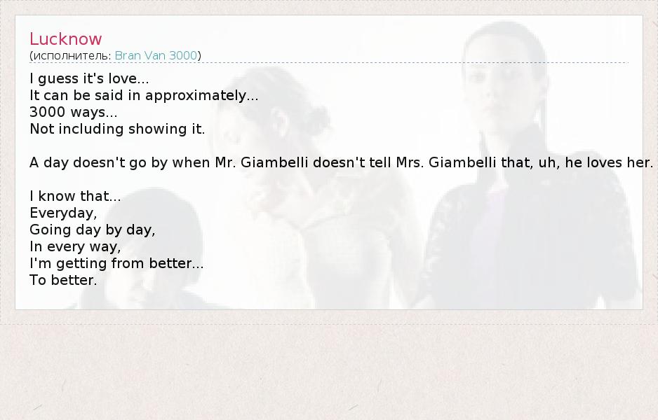 Это интересно:Bran Van 3000 (also known as Bran Van and BV3) is an electronica collective from Montreal, Canada. Founded by DJ James Di Salvio and E.P. Bergen, they collaborated on a number of songs with Stéphane Moraille, Sara Johnston, Steve "Liquid" Hawley, Jayne Hill, Québécois rock star Jean Leloup and other musicians.HistoryJames Di Salvio and E.P. Bergen got together in Manhattan and coined Bran Van 3000 in 1994. Di Salvio was a video director and asked E.P. to come teach him how to produce tracks with a sampler and turntables. Together they went and bought studio equipment in Times Square. E.P. returned to Montreal and immediately co-wrote/produced a single with Jean Leloup called:... продолжение