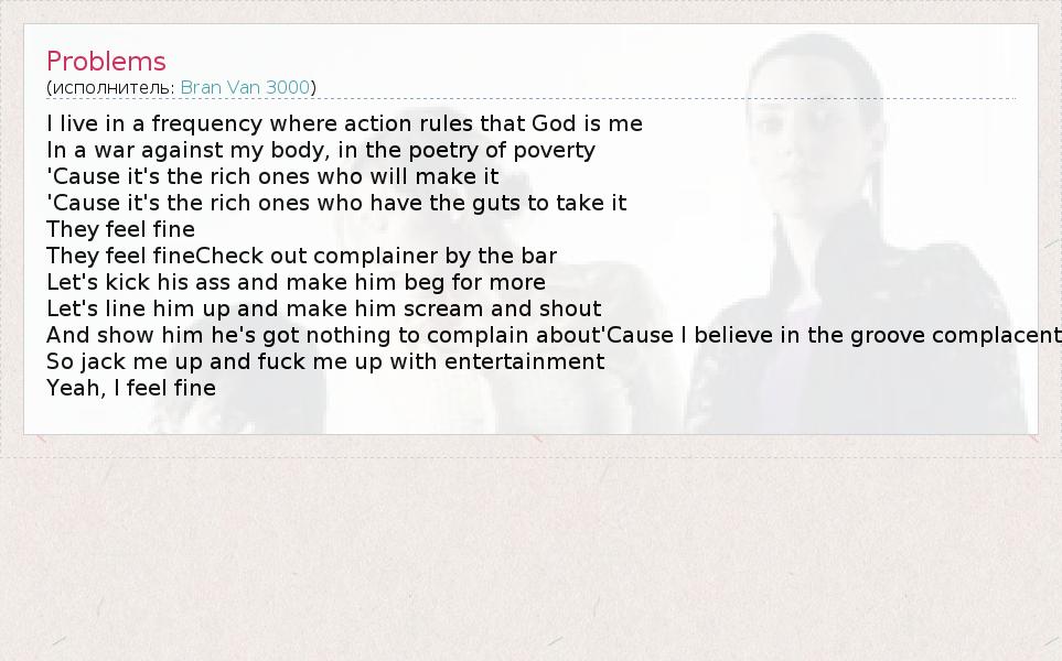 Это интересно:Bran Van 3000 (also known as Bran Van and BV3) is an electronica collective from Montreal, Canada. Founded by DJ James Di Salvio and E.P. Bergen, they collaborated on a number of songs with Stéphane Moraille, Sara Johnston, Steve "Liquid" Hawley, Jayne Hill, Québécois rock star Jean Leloup and other musicians.HistoryJames Di Salvio and E.P. Bergen got together in Manhattan and coined Bran Van 3000 in 1994. Di Salvio was a video director and asked E.P. to come teach him how to produce tracks with a sampler and turntables. Together they went and bought studio equipment in Times Square. E.P. returned to Montreal and immediately co-wrote/produced a single with Jean Leloup called:... продолжение