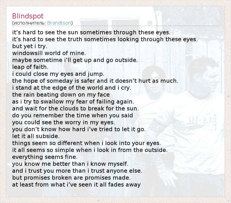 it's hard to see the sun sometimes through these eyes. it's hard to see the truth sometimes looking through these eyes. but yet i try. windowsill world of mine. maybe sometime i'll get up and go outside. leap of faith. i could close my eyes and jump. the hope of someday is safer and it doesn't hurt as much. i stand at the edge of the world and i cry. the rain beating down on my face as i try to swallow my fear of failing again. and wait for the clouds to break for the sun. do you remember the time when you said you could see the worry in my eyes. you don't know how hard i've tried to let it go. let it all subside. things seem so different when i look into your eyes. it all seems so simple when i look in from the outside. everything seems fine. you know me better than i know myself. and i trust you more than i trust anyone else. but promises broken are promises made. at least from what i've seen it all fades away