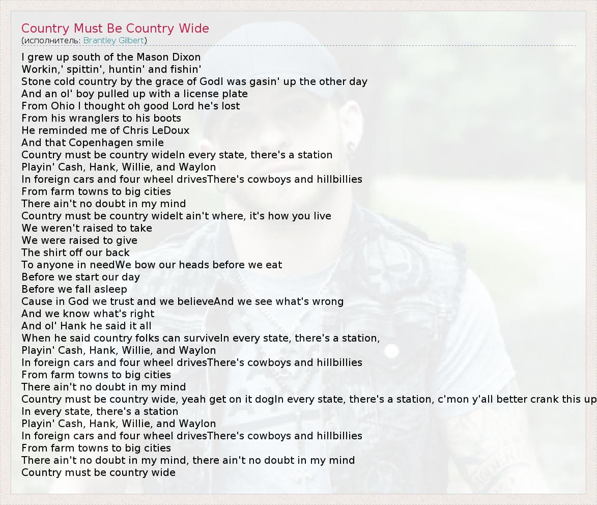 I grew up south of the Mason Dixon Workin,' spittin', huntin' and fishin' Stone cold country by the grace of GodI was gasin' up the other day And an ol' boy pulled up with a license plate From Ohio I thought oh good Lord he's lost From his wranglers to his boots He reminded me of Chris LeDoux And that Copenhagen smile Country must be country wideIn every state, there's a station Playin' Cash, Hank, Willie, and Waylon In foreign cars and four wheel drivesThere's cowboys and hillbillies From farm towns to big cities There ain't no doubt in my mind Country must be country wideIt ain't where, it's how you live We weren't raised to take We were raised to give The shirt off our back To anyone in needWe bow our heads before we eat Before we start our day Before we fall asleep Cause in God we trust and we believeAnd we see what's wrong And we know what's right And ol' Hank he said it all When he said country folks can surviveIn every state, there's a station, Playin' Cash, Hank, Willie, and Waylon In foreign cars and four wheel drivesThere's cowboys and hillbillies From farm towns to big cities There ain't no doubt in my mind Country must be country wide, yeah get on it dogIn every state, there's a station, c'mon y'all better crank this up In every state, there's a station Playin' Cash, Hank, Willie, and Waylon In foreign cars and four wheel drivesThere's cowboys and hillbillies From farm towns to big cities There ain't no doubt in my mind, there ain't no doubt in my mind Country must be country wide