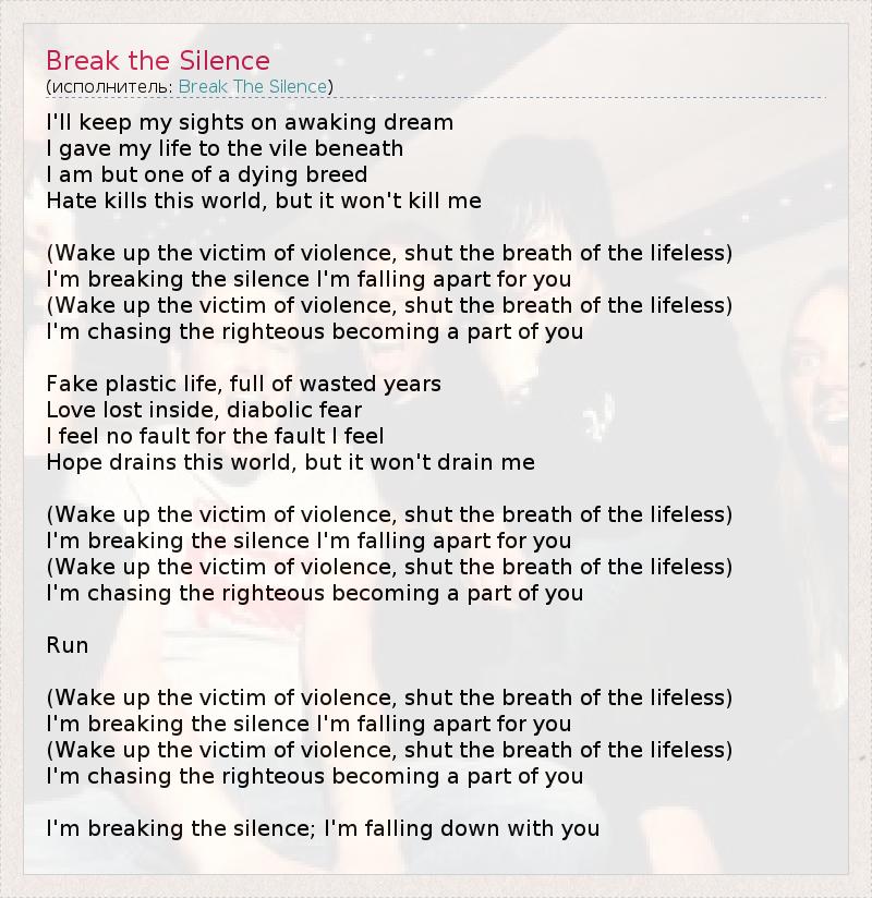 I'll keep my sights on awaking dream I gave my life to the vile beneath I am but one of a dying breed Hate kills this world, but it won't kill me (Wake up the victim of violence, shut the breath of the lifeless) I'm breaking the silence I'm falling apart for you (Wake up the victim of violence, shut the breath of the lifeless) I'm chasing the righteous becoming a part of you Fake plastic life, full of wasted years Love lost inside, diabolic fear I feel no fault for the fault I feel Hope drains this world, but it won't drain me (Wake up the victim of violence, shut the breath of the lifeless) I'm breaking the silence I'm falling apart for you (Wake up the victim of violence, shut the breath of the lifeless) I'm chasing the righteous becoming a part of you Run (Wake up the victim of violence, shut the breath of the lifeless) I'm breaking the silence I'm falling apart for you (Wake up the victim of violence, shut the breath of the lifeless) I'm chasing the righteous becoming a part of you I'm breaking the silence; I'm falling down with you