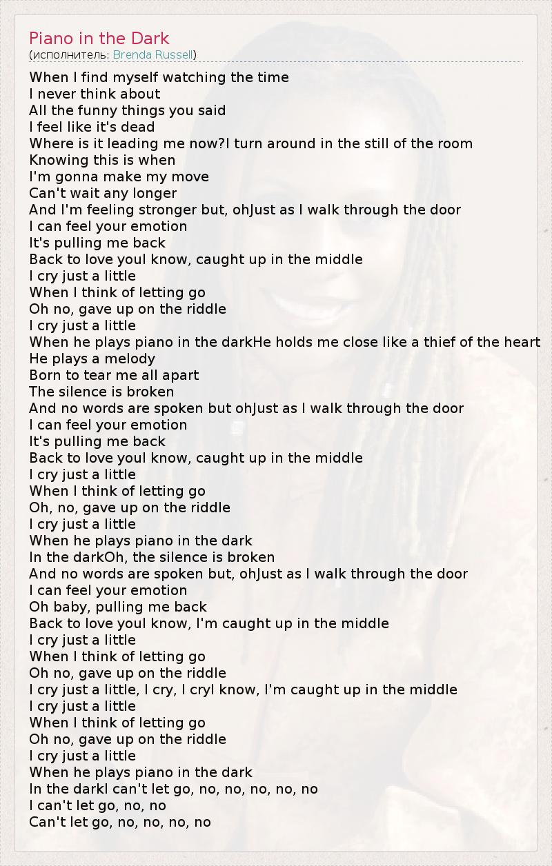 When I find myself watching the time I never think about All the funny things you said I feel like it's dead Where is it leading me now?I turn around in the still of the room Knowing this is when I'm gonna make my move Can't wait any longer And I'm feeling stronger but, ohJust as I walk through the door I can feel your emotion It's pulling me back Back to love youI know, caught up in the middle I cry just a little When I think of letting go Oh no, gave up on the riddle I cry just a little When he plays piano in the darkHe holds me close like a thief of the heart He plays a melody Born to tear me all apart The silence is broken And no words are spoken but ohJust as I walk through the door I can feel your emotion It's pulling me back Back to love youI know, caught up in the middle I cry just a little When I think of letting go Oh, no, gave up on the riddle I cry just a little When he plays piano in the dark In the darkOh, the silence is broken And no words are spoken but, ohJust as I walk through the door I can feel your emotion Oh baby, pulling me back Back to love youI know, I'm caught up in the middle I cry just a little When I think of letting go Oh no, gave up on the riddle I cry just a little, I cry, I cryI know, I'm caught up in the middle I cry just a little When I think of letting go Oh no, gave up on the riddle I cry just a little When he plays piano in the dark In the darkI can't let go, no, no, no, no, no I can't let go, no, no Can't let go, no, no, no, no