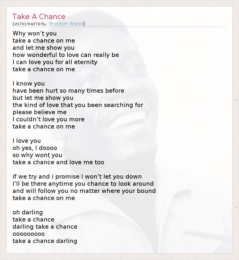 Why won't you take a chance on me and let me show you how wonderful to love can really be I can love you for all eternity take a chance on me I know you have been hurt so many times before but let me show you the kind of love that you been searching for please believe me I couldn't love you more take a chance on me I love you oh yes, I doooo so why wont you take a chance and love me too if we try and i promise I won't let you down I'll be there anytime you chance to look around and will follow you no matter where your bound take a chance on me oh darling take a chance darling take a chance ooooooooo take a chance darling