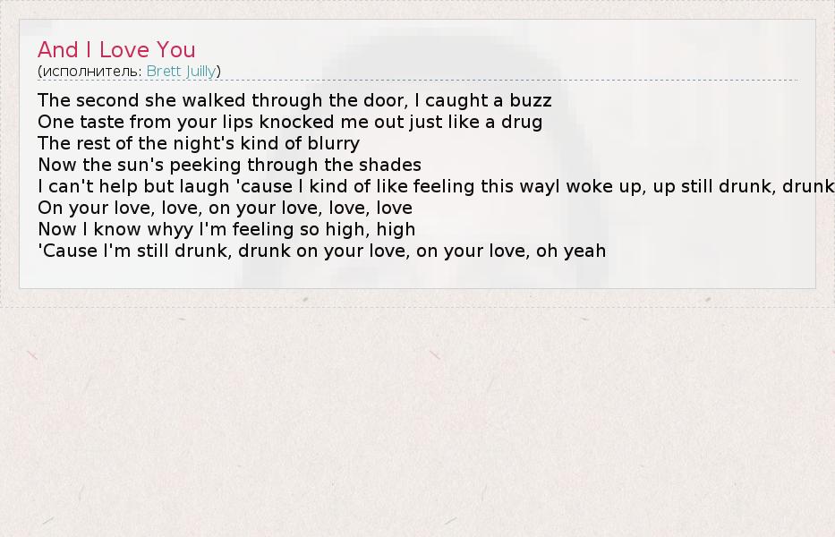 The second she walked through the door, I caught a buzz One taste from your lips knocked me out just like a drug The rest of the night's kind of blurry Now the sun's peeking through the shades I can't help but laugh 'cause I kind of like feeling this wayI woke up, up still drunk, drunk On your love, love, on your love, love, love Now I know whyy I'm feeling so high, high 'Cause I'm still drunk, drunk on your love, on your love, oh yeah