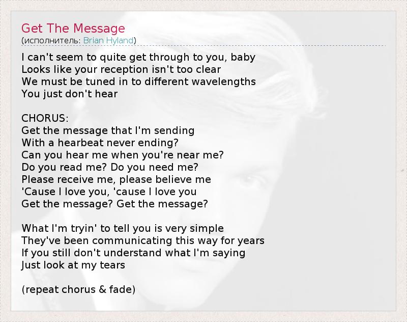 I can't seem to quite get through to you, baby Looks like your reception isn't too clear We must be tuned in to different wavelengths You just don't hear CHORUS: Get the message that I'm sending With a hearbeat never ending? Can you hear me when you're near me? Do you read me? Do you need me? Please receive me, please believe me 'Cause I love you, 'cause I love you Get the message? Get the message? What I'm tryin' to tell you is very simple They've been communicating this way for years If you still don't understand what I'm saying Just look at my tears (repeat chorus & fade)