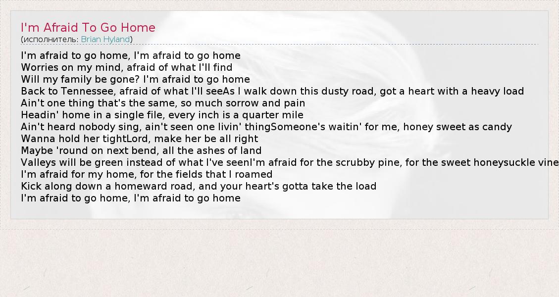 I'm afraid to go home, I'm afraid to go home Worries on my mind, afraid of what I'll find Will my family be gone? I'm afraid to go home Back to Tennessee, afraid of what I'll seeAs I walk down this dusty road, got a heart with a heavy load Ain't one thing that's the same, so much sorrow and pain Headin' home in a single file, every inch is a quarter mile Ain't heard nobody sing, ain't seen one livin' thingSomeone's waitin' for me, honey sweet as candy Wanna hold her tightLord, make her be all right Maybe 'round on next bend, all the ashes of land Valleys will be green instead of what I've seenI'm afraid for the scrubby pine, for the sweet honeysuckle vine I'm afraid for my home, for the fields that I roamed Kick along down a homeward road, and your heart's gotta take the load I'm afraid to go home, I'm afraid to go home