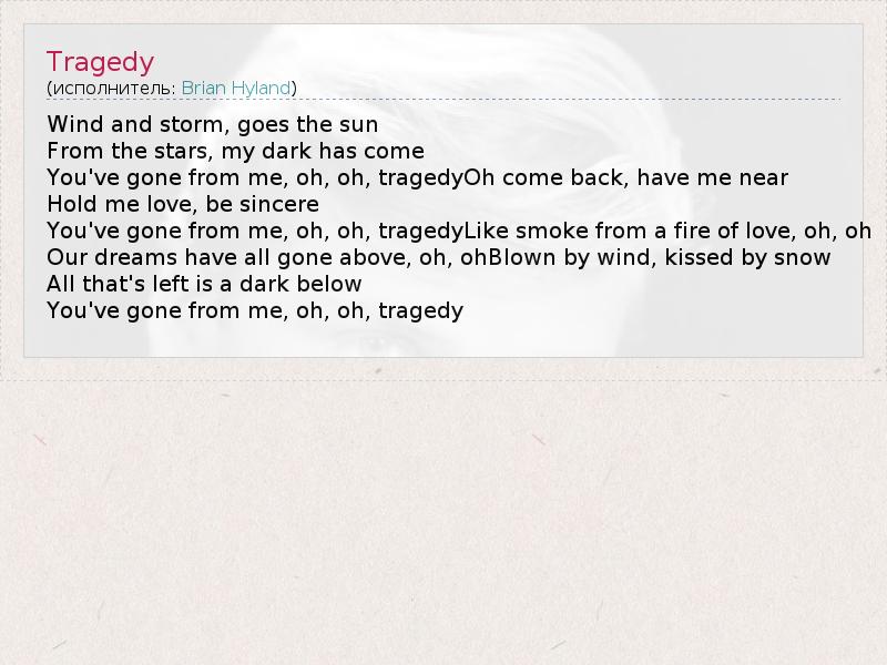 Wind and storm, goes the sun From the stars, my dark has come You've gone from me, oh, oh, tragedyOh come back, have me near Hold me love, be sincere You've gone from me, oh, oh, tragedyLike smoke from a fire of love, oh, oh Our dreams have all gone above, oh, ohBlown by wind, kissed by snow All that's left is a dark below You've gone from me, oh, oh, tragedy