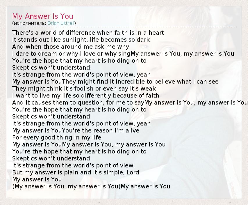 There's a world of difference when faith is in a heart It stands out like sunlight, life becomes so dark And when those around me ask me why I dare to dream or why I love or why singMy answer is You, my answer is You You're the hope that my heart is holding on to Skeptics won't understand It's strange from the world's point of view, yeah My answer is YouThey might find it incredible to believe what I can see They might think it's foolish or even say it's weak I want to live my life so differently because of faith And it causes them to question, for me to sayMy answer is You, my answer is You You're the hope that my heart is holding on to Skeptics won't understand It's strange from the world's point of view, yeah My answer is YouYou're the reason I'm alive For every good thing in my life My answer is YouMy answer is You, my answer is You You're the hope that my heart is holding on to Skeptics won't understand It's strange from the world's point of view But my answer is plain and it's simple, Lord My answer is You (My answer is You, my answer is You)My answer is You