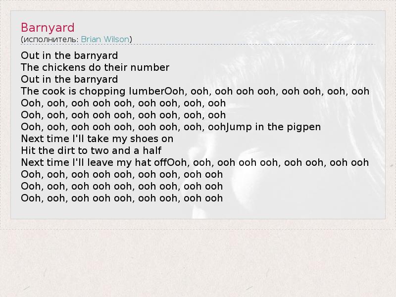 Out in the barnyard The chickens do their number Out in the barnyard The cook is chopping lumberOoh, ooh, ooh ooh ooh, ooh ooh, ooh, ooh Ooh, ooh, ooh ooh ooh, ooh ooh, ooh, ooh Ooh, ooh, ooh ooh ooh, ooh ooh, ooh, ooh Ooh, ooh, ooh ooh ooh, ooh ooh, ooh, oohJump in the pigpen Next time I'll take my shoes on Hit the dirt to two and a half Next time I'll leave my hat offOoh, ooh, ooh ooh ooh, ooh ooh, ooh ooh Ooh, ooh, ooh ooh ooh, ooh ooh, ooh ooh Ooh, ooh, ooh ooh ooh, ooh ooh, ooh ooh Ooh, ooh, ooh ooh ooh, ooh ooh, ooh ooh