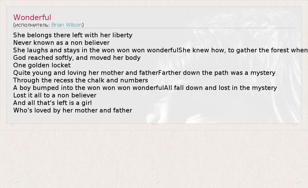 Это интересно:Брайан Уилсон (род. 20.06.1942) - американский музыкант, основатель и вдохновитель группы Beach Boys. Как судьба любого гения, судьба Брайана трагична. Вследствии внутреннего дуализма, он провел много лет в добровольном изгнании с диагнозом "шизофрения". За 1967-1989 года Брайан практически молчал и ничего не делал. Сейчас он пришел в себя, о чем свидетельствует и название его альбома 2008 года - That... продолжение