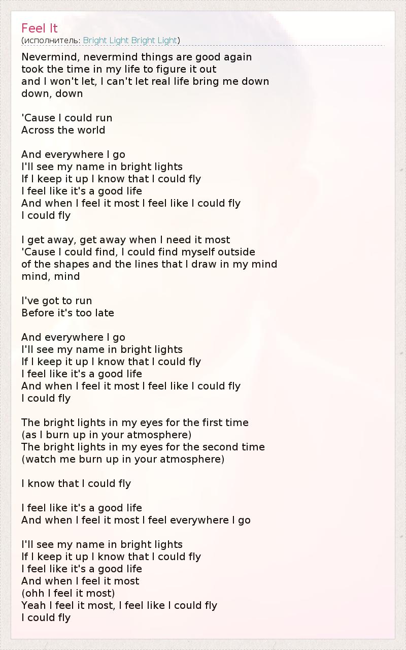 Nevermind, nevermind things are good again took the time in my life to figure it out and I won't let, I can't let real life bring me down down, down 'Cause I could run Across the world And everywhere I go I'll see my name in bright lights If I keep it up I know that I could fly I feel like it's a good life And when I feel it most I feel like I could fly I could fly I get away, get away when I need it most 'Cause I could find, I could find myself outside of the shapes and the lines that I draw in my mind mind, mind I've got to run Before it's too late And everywhere I go I'll see my name in bright lights If I keep it up I know that I could fly I feel like it's a good life And when I feel it most I feel like I could fly I could fly The bright lights in my eyes for the first time (as I burn up in your atmosphere) The bright lights in my eyes for the second time (watch me burn up in your atmosphere) I know that I could fly I feel like it's a good life And when I feel it most I feel everywhere I go I'll see my name in bright lights If I keep it up I know that I could fly I feel like it's a good life And when I feel it most (ohh I feel it most) Yeah I feel it most, I feel like I could fly I could fly