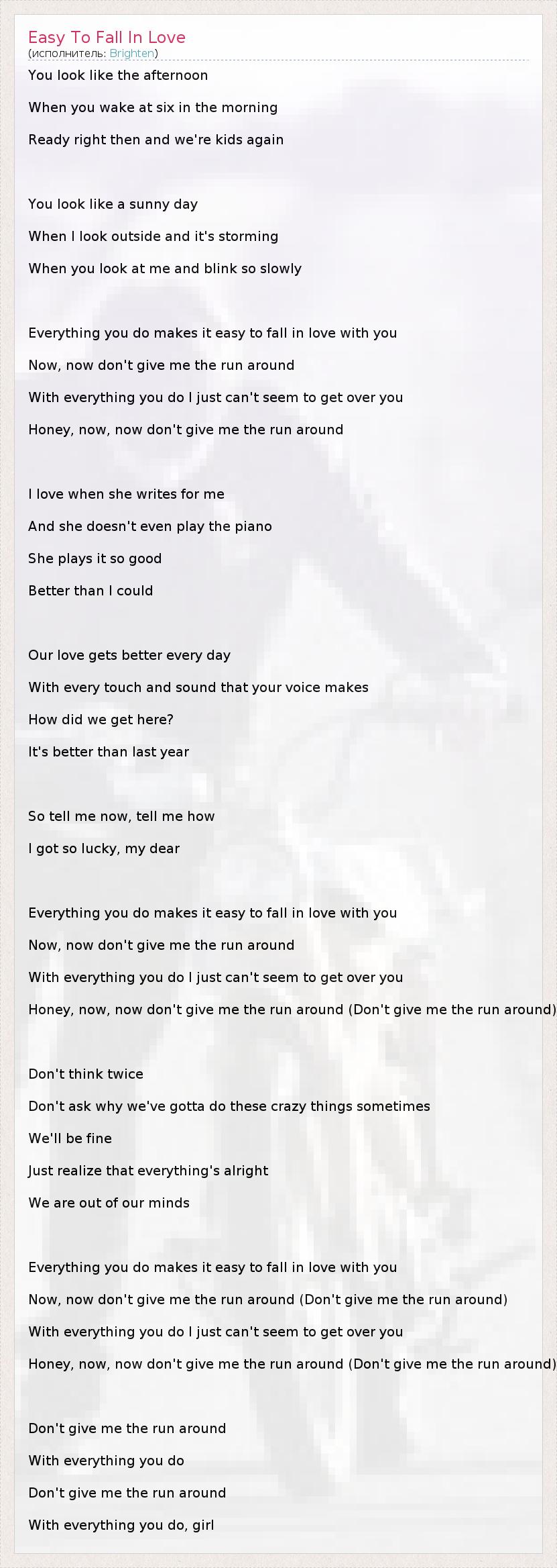 You look like the afternoon When you wake at six in the morning Ready right then and we're kids again You look like a sunny day When I look outside and it's storming When you look at me and blink so slowly Everything you do makes it easy to fall in love with you Now, now don't give me the run around With everything you do I just can't seem to get over you Honey, now, now don't give me the run around I love when she writes for me And she doesn't even play the piano She plays it so good Better than I could Our love gets better every day With every touch and sound that your voice makes How did we get here? It's better than last year So tell me now, tell me how I got so lucky, my dear Everything you do makes it easy to fall in love with you Now, now don't give me the run around With everything you do I just can't seem to get over you Honey, now, now don't give me the run around (Don't give me the run around) Don't think twice Don't ask why we've gotta do these crazy things sometimes We'll be fine Just realize that everything's alright We are out of our minds Everything you do makes it easy to fall in love with you Now, now don't give me the run around (Don't give me the run around) With everything you do I just can't seem to get over you Honey, now, now don't give me the run around (Don't give me the run around) Don't give me the run around With everything you do Don't give me the run around With everything you do, girl