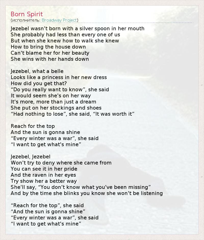 Иезавель родилась в небогатой семье, Скорее, у неё было меньше каждого из нас. Но, едва научившись ходить, Она уже знала, как вызвать восхищение публики. Нельзя винить её за красоту, Она побеждает, не прилагая усилий. Иезавель, какая красавица! Она похожа на принцессу в своем новом платье. «Откуда у тебя такое?» «Ты действительно хочешь знать?» - ответила она. Может показаться, что она нашла свою дорогу, Что это больше, чем просто мечта. Она надела свои чулки и туфли: «Мне нечего терять, - сказала она, - это того стоит». Достигни вершины - И солнце засияет. «Каждую зиму была война, - сказала она, - Я хочу получить то, что принадлежит мне». Иезавель, Иезавель, Не стану отрицать, откуда она родом. Она горда, А в глазах - ворон. Попытайся показать ей лучший путь, И она скажет: «Ты не знаешь, что теряешь». И когда она подмигнет тебе, знай, она не будет слушать. «Достигни вершины, - сказала она, - И солнце засияет» «Каждую зиму была война, - сказала она, - Я хочу получить то, что принадлежит мне».