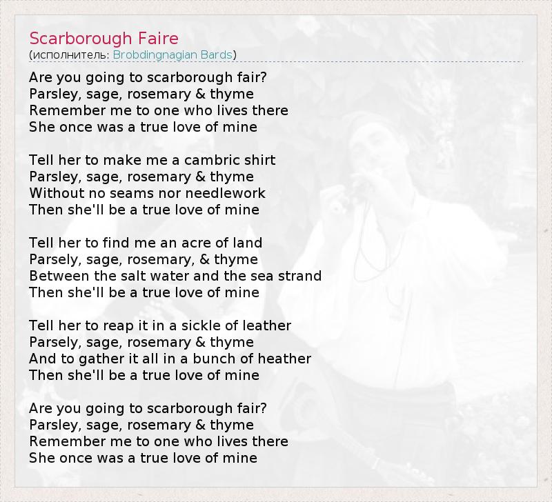 Вы едете на ярмарку в Скарборо? Петрушка, шалфей, розмарин и чабрец, Передайте привет человеку, который там живет, Когда-то он был моей настоящей любовью. Скажите ему, пусть он сошьет мне рубашку из батиста, Петрушка, шалфей, розмарин и чабрец, Без иголки и без швов, Тогда он будет моей настоящей любовью. Скажите ему, пусть он найдет мне акр земли, Петрушка, шалфей, розмарин и чабрец, Между соленой морской водой и побережьем, Тогда он будет моей настоящей любовью. Скажите ему, пусть он соберет с него урожай кожаным серпом, Петрушка, шалфей, розмарин и чабрец, И сложит все в связку вереска, Тогда он будет моей настоящей любовью. Вы едете на ярмарку в Скарборо? Петрушка, шалфей, розмарин и чабрец, Передайте привет человеку, который там живет, Когда-то он был моей настоящей любовью.