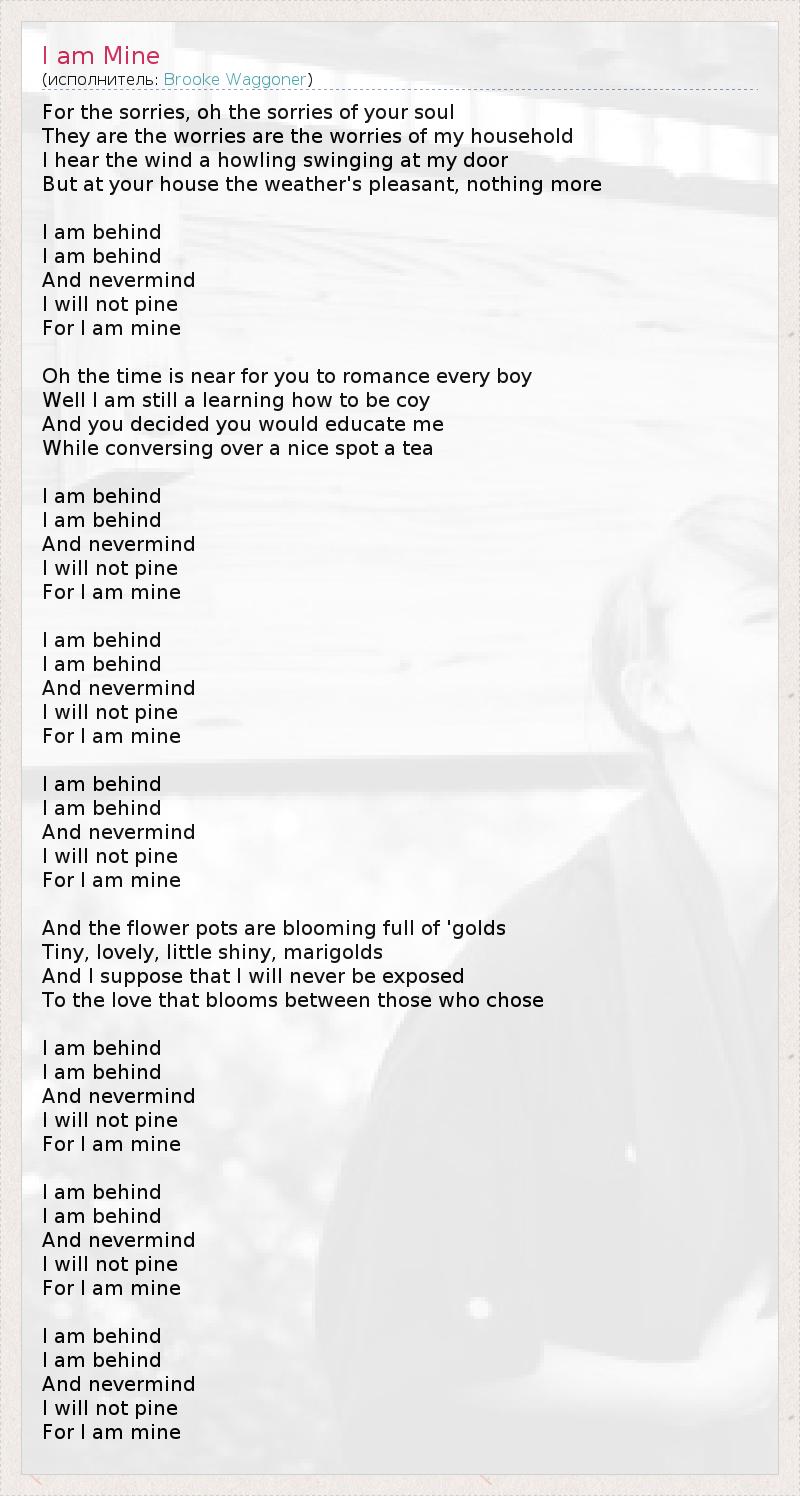 For the sorries, oh the sorries of your soul They are the worries are the worries of my household I hear the wind a howling swinging at my door But at your house the weather's pleasant, nothing more I am behind I am behind And nevermind I will not pine For I am mine Oh the time is near for you to romance every boy Well I am still a learning how to be coy And you decided you would educate me While conversing over a nice spot a tea I am behind I am behind And nevermind I will not pine For I am mine I am behind I am behind And nevermind I will not pine For I am mine I am behind I am behind And nevermind I will not pine For I am mine And the flower pots are blooming full of 'golds Tiny, lovely, little shiny, marigolds And I suppose that I will never be exposed To the love that blooms between those who chose I am behind I am behind And nevermind I will not pine For I am mine I am behind I am behind And nevermind I will not pine For I am mine I am behind I am behind And nevermind I will not pine For I am mine