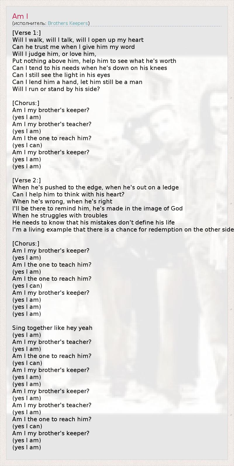 [Verse 1:] Will I walk, will I talk, will I open up my heart Can he trust me when I give him my word Will I judge him, or love him, Put nothing above him, help him to see what he's worth Can I tend to his needs when he's down on his knees Can I still see the light in his eyes Can I lend him a hand, let him still be a man Will I run or stand by his side? [Chorus:] Am I my brother's keeper? (yes I am) Am I my brother's teacher? (yes I am) Am I the one to reach him? (yes I can) Am I my brother's keeper? (yes I am) (yes I am) [Verse 2:] When he's pushed to the edge, when he's out on a ledge Can I help him to think with his heart? When he's wrong, when he's right I'll be there to remind him, he's made in the image of God When he struggles with troubles He needs to know that his mistakes don't define his life I'm a living example that there is a chance for redemption on the other side [Chorus:] Am I my brother's keeper? (yes I am) Am I the one to teach him? (yes I am) Am I the one to reach him? (yes I can) Am I my brother's keeṗer? (yes I am) (yes I am) (yes I am) Sing together like hey yeah (yes I am) Am I my brother's teacher? (yes I am) Am I the one to reach him? (yes I can) Am I my brother's keeper? (yes I am) (yes I am) Am I my brother's keeper? (yes I am) Am I my brother's teacher? (yes I am) Am I the one to reach him? (yes I can) Am I my brother's keeper? (yes I am) (yes I am)