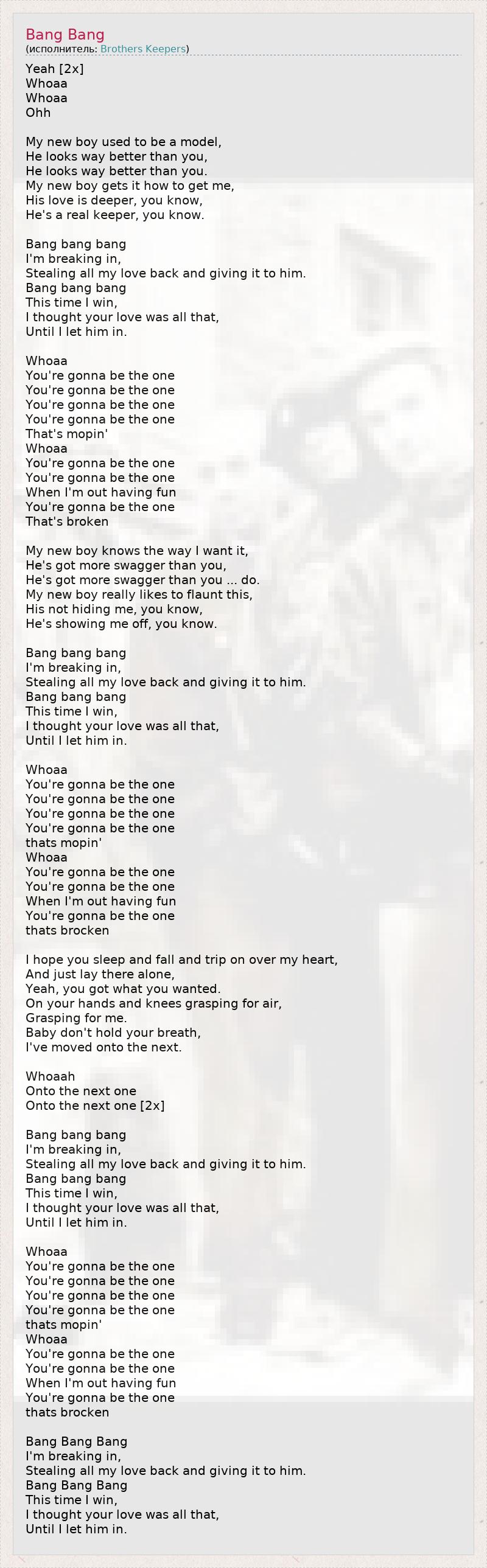 Yeah [2x] Whoaa Whoaa Ohh My new boy used to be a model, He looks way better than you, He looks way better than you. My new boy gets it how to get me, His love is deeper, you know, He's a real keeper, you know. Bang bang bang I'm breaking in, Stealing all my love back and giving it to him. Bang bang bang This time I win, I thought your love was all that, Until I let him in. Whoaa You're gonna be the one You're gonna be the one You're gonna be the one You're gonna be the one That's mopin' Whoaa You're gonna be the one You're gonna be the one When I'm out having fun You're gonna be the one That's broken My new boy knows the way I want it, He's got more swagger than you, He's got more swagger than you ... do. My new boy really likes to flaunt this, His not hiding me, you know, He's showing me off, you know. Bang bang bang I'm breaking in, Stealing all my love back and giving it to him. Bang bang bang This time I win, I thought your love was all that, Until I let him in. Whoaa You're gonna be the one You're gonna be the one You're gonna be the one You're gonna be the one thats mopin' Whoaa You're gonna be the one You're gonna be the one When I'm out having fun You're gonna be the one thats brocken I hope you sleep and fall and trip on over my heart, And just lay there alone, Yeah, you got what you wanted. On your hands and knees grasping for air, Grasping for me. Baby don't hold your breath, I've moved onto the next. Whoaah Onto the next one Onto the next one [2x] Bang bang bang I'm breaking in, Stealing all my love back and giving it to him. Bang bang bang This time I win, I thought your love was all that, Until I let him in. Whoaa You're gonna be the one You're gonna be the one You're gonna be the one You're gonna be the one thats mopin' Whoaa You're gonna be the one You're gonna be the one When I'm out having fun You're gonna be the one thats brocken Bang Bang Bang I'm breaking in, Stealing all my love back and giving it to him. Bang Bang Bang This time I win, I thought your love was all that, Until I let him in.