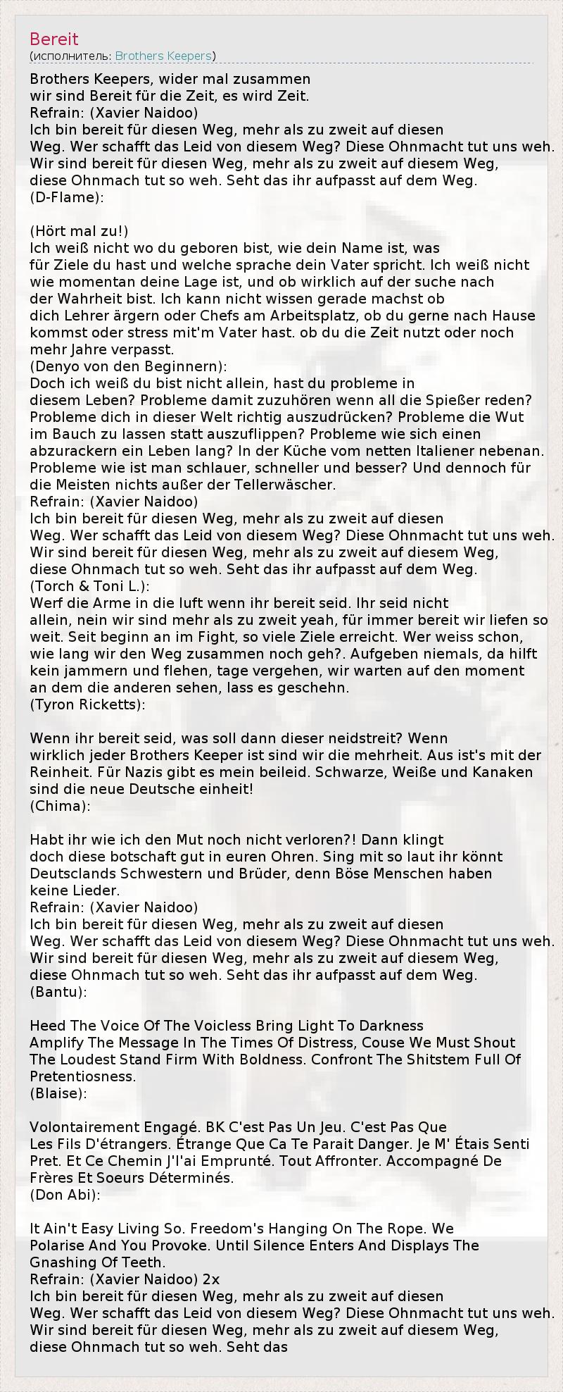 Brothers Keepers, wider mal zusammen wir sind Bereit für die Zeit, es wird Zeit. Refrain: (Xavier Naidoo) Ich bin bereit für diesen Weg, mehr als zu zweit auf diesen Weg. Wer schafft das Leid von diesem Weg? Diese Ohnmacht tut uns weh. Wir sind bereit für diesen Weg, mehr als zu zweit auf diesem Weg, diese Ohnmach tut so weh. Seht das ihr aufpasst auf dem Weg. (D-Flame): (Hört mal zu!) Ich weiß nicht wo du geboren bist, wie dein Name ist, was für Ziele du hast und welche sprache dein Vater spricht. Ich weiß nicht wie momentan deine Lage ist, und ob wirklich auf der suche nach der Wahrheit bist. Ich kann nicht wissen gerade machst ob dich Lehrer ärgern oder Chefs am Arbeitsplatz, ob du gerne nach Hause kommst oder stress mit'm Vater hast. ob du die Zeit nutzt oder noch mehr Jahre verpasst. (Denyo von den Beginnern): Doch ich weiß du bist nicht allein, hast du probleme in diesem Leben? Probleme damit zuzuhören wenn all die Spießer reden? Probleme dich in dieser Welt richtig auszudrücken? Probleme die Wut im Bauch zu lassen statt auszuflippen? Probleme wie sich einen abzurackern ein Leben lang? In der Küche vom netten Italiener nebenan. Probleme wie ist man schlauer, schneller und besser? Und dennoch für die Meisten nichts außer der Tellerwäscher. Refrain: (Xavier Naidoo) Ich bin bereit für diesen Weg, mehr als zu zweit auf diesen Weg. Wer schafft das Leid von diesem Weg? Diese Ohnmacht tut uns weh. Wir sind bereit für diesen Weg, mehr als zu zweit auf diesem Weg, diese Ohnmach tut so weh. Seht das ihr aufpasst auf dem Weg. (Torch & Toni L.): Werf die Arme in die luft wenn ihr bereit seid. Ihr seid nicht allein, nein wir sind mehr als zu zweit yeah, für immer bereit wir liefen so weit. Seit beginn an im Fight, so viele Ziele erreicht. Wer weiss schon, wie lang wir den Weg zusammen noch geh?. Aufgeben niemals, da hilft kein jammern und flehen, tage vergehen, wir warten auf den moment an dem die anderen sehen, lass es geschehn. (Tyron Ricketts): Wenn ihr bereit seid, was soll dann dieser neidstreit? Wenn wirklich jeder Brothers Keeper ist sind wir die mehrheit. Aus ist's mit der Reinheit. Für Nazis gibt es mein beileid. Schwarze, Weiße und Kanaken sind die neue Deutsche einheit! (Chima): Habt ihr wie ich den Mut noch nicht verloren?! Dann klingt doch diese botschaft gut in euren Ohren. Sing mit so laut ihr könnt Deutsclands Schwestern und Brüder, denn Böse Menschen haben keine Lieder. Refrain: (Xavier Naidoo) Ich bin bereit für diesen Weg, mehr als zu zweit auf diesen Weg. Wer schafft das Leid von diesem Weg? Diese Ohnmacht tut uns weh. Wir sind bereit für diesen Weg, mehr als zu zweit auf diesem Weg, diese Ohnmach tut so weh. Seht das ihr aufpasst auf dem Weg. (Bantu): Heed The Voice Of The Voicless Bring Light To Darkness Amplify The Message In The Times Of Distress, Couse We Must Shout The Loudest Stand Firm With Boldness. Confront The Shitstem Full Of Pretentiosness. (Blaise): Volontairement Engagé. BK C'est Pas Un Jeu. C'est Pas Que Les Fils D'étrangers. Étrange Que Ca Te Parait Danger. Je M' Étais Senti Pret. Et Ce Chemin J'l'ai Emprunté. Tout Affronter. Accompagné De Frères Et Soeurs Déterminés. (Don Abi): It Ain't Easy Living So. Freedom's Hanging On The Rope. We Polarise And You Provoke. Until Silence Enters And Displays The Gnashing Of Teeth. Refrain: (Xavier Naidoo) 2x Ich bin bereit für diesen Weg, mehr als zu zweit auf diesen Weg. Wer schafft das Leid von diesem Weg? Diese Ohnmacht tut uns weh. Wir sind bereit für diesen Weg, mehr als zu zweit auf diesem Weg, diese Ohnmach tut so weh. Seht das