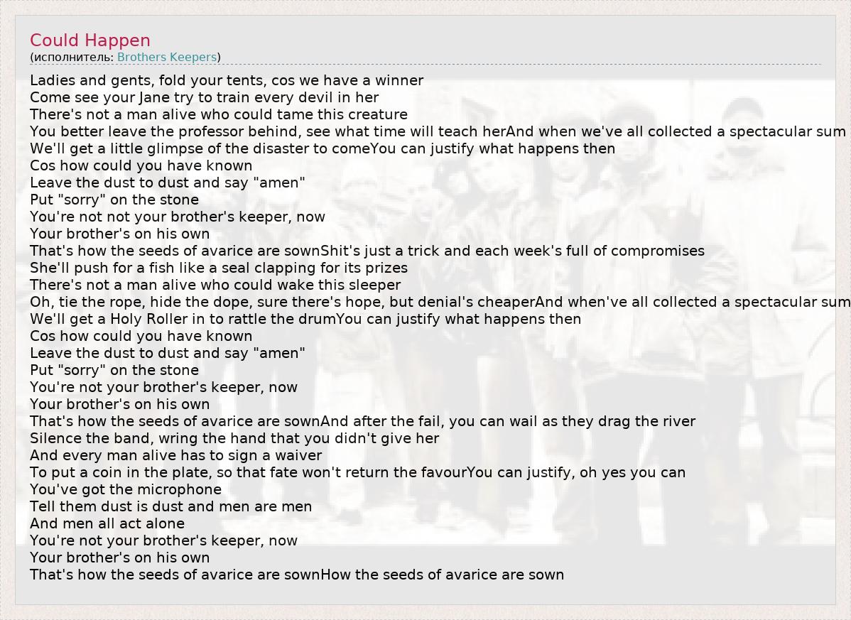 Ladies and gents, fold your tents, cos we have a winner Come see your Jane try to train every devil in her There's not a man alive who could tame this creature You better leave the professor behind, see what time will teach herAnd when we've all collected a spectacular sum We'll get a little glimpse of the disaster to comeYou can justify what happens then Cos how could you have known Leave the dust to dust and say "amen" Put "sorry" on the stone You're not not your brother's keeper, now Your brother's on his own That's how the seeds of avarice are sownShit's just a trick and each week's full of compromises She'll push for a fish like a seal clapping for its prizes There's not a man alive who could wake this sleeper Oh, tie the rope, hide the dope, sure there's hope, but denial's cheaperAnd when've all collected a spectacular sum We'll get a Holy Roller in to rattle the drumYou can justify what happens then Cos how could you have known Leave the dust to dust and say "amen" Put "sorry" on the stone You're not your brother's keeper, now Your brother's on his own That's how the seeds of avarice are sownAnd after the fail, you can wail as they drag the river Silence the band, wring the hand that you didn't give her And every man alive has to sign a waiver To put a coin in the plate, so that fate won't return the favourYou can justify, oh yes you can You've got the microphone Tell them dust is dust and men are men And men all act alone You're not your brother's keeper, now Your brother's on his own That's how the seeds of avarice are sownHow the seeds of avarice are sown