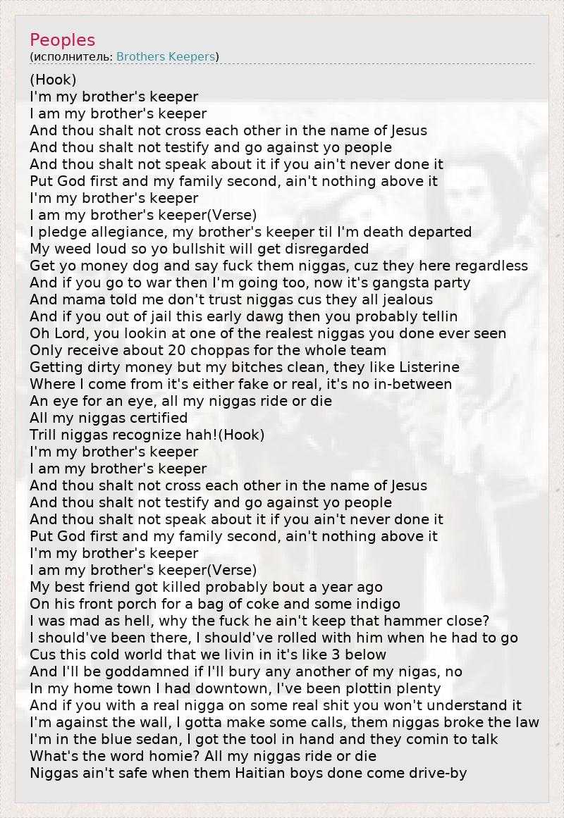 (Hook) I'm my brother's keeper I am my brother's keeper And thou shalt not cross each other in the name of Jesus And thou shalt not testify and go against yo people And thou shalt not speak about it if you ain't never done it Put God first and my family second, ain't nothing above it I'm my brother's keeper I am my brother's keeper(Verse) I pledge allegiance, my brother's keeper til I'm death departed My weed loud so yo bullshit will get disregarded Get yo money dog and say fuck them niggas, cuz they here regardless And if you go to war then I'm going too, now it's gangsta party And mama told me don't trust niggas cus they all jealous And if you out of jail this early dawg then you probably tellin Oh Lord, you lookin at one of the realest niggas you done ever seen Only receive about 20 choppas for the whole team Getting dirty money but my bitches clean, they like Listerine Where I come from it's either fake or real, it's no in-between An eye for an eye, all my niggas ride or die All my niggas certified Trill niggas recognize hah!(Hook) I'm my brother's keeper I am my brother's keeper And thou shalt not cross each other in the name of Jesus And thou shalt not testify and go against yo people And thou shalt not speak about it if you ain't never done it Put God first and my family second, ain't nothing above it I'm my brother's keeper I am my brother's keeper(Verse) My best friend got killed probably bout a year ago On his front porch for a bag of coke and some indigo I was mad as hell, why the fuck he ain't keep that hammer close? I should've been there, I should've rolled with him when he had to go Cus this cold world that we livin in it's like 3 below And I'll be goddamned if I'll bury any another of my nigas, no In my home town I had downtown, I've been plottin plenty And if you with a real nigga on some real shit you won't understand it I'm against the wall, I gotta make some calls, them niggas broke the law I'm in the blue sedan, I got the tool in hand and they comin to talk What's the word homie? All my niggas ride or die Niggas ain't safe when them Haitian boys done come drive-by