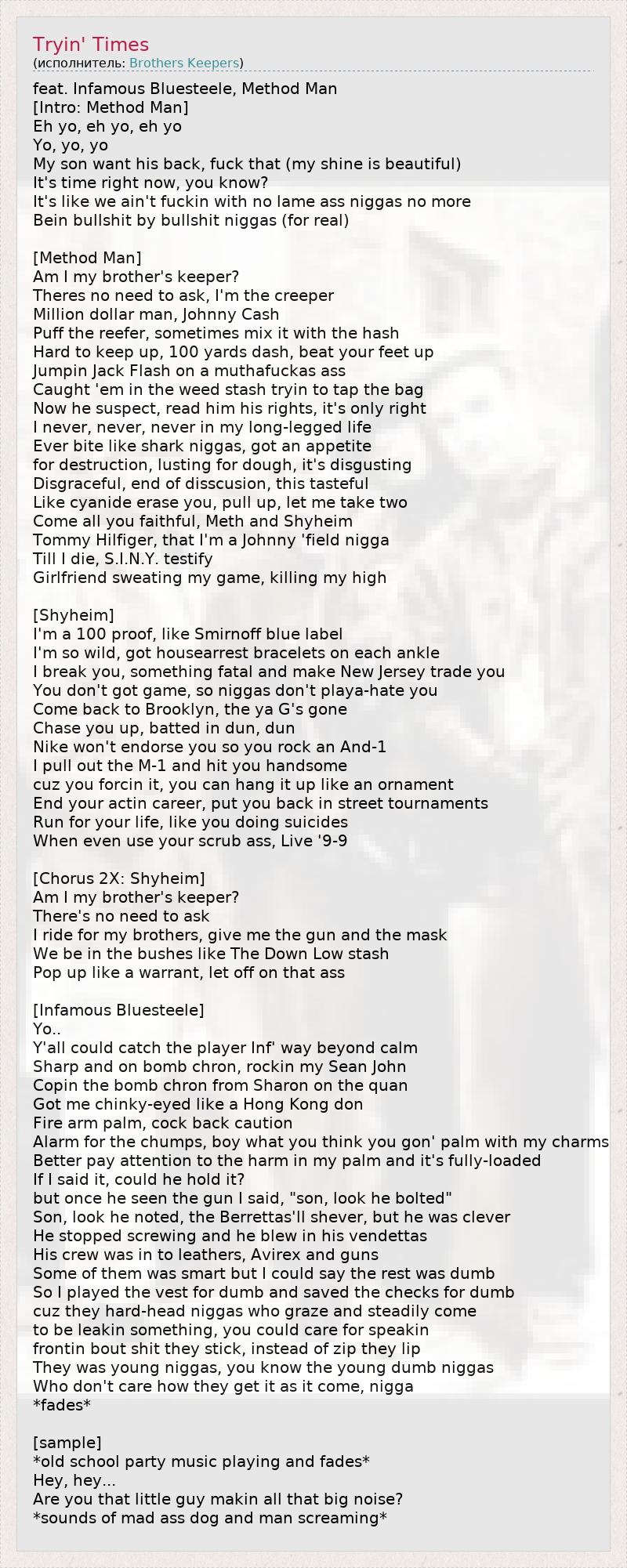 feat. Infamous Bluesteele, Method Man [Intro: Method Man] Eh yo, eh yo, eh yo Yo, yo, yo My son want his back, fuck that (my shine is beautiful) It's time right now, you know? It's like we ain't fuckin with no lame ass niggas no more Bein bullshit by bullshit niggas (for real) [Method Man] Am I my brother's keeper? Theres no need to ask, I'm the creeper Million dollar man, Johnny Cash Puff the reefer, sometimes mix it with the hash Hard to keep up, 100 yards dash, beat your feet up Jumpin Jack Flash on a muthafuckas ass Caught 'em in the weed stash tryin to tap the bag Now he suspect, read him his rights, it's only right I never, never, never in my long-legged life Ever bite like shark niggas, got an appetite for destruction, lusting for dough, it's disgusting Disgraceful, end of disscusion, this tasteful Like cyanide erase you, pull up, let me take two Come all you faithful, Meth and Shyheim Tommy Hilfiger, that I'm a Johnny 'field nigga Till I die, S.I.N.Y. testify Girlfriend sweating my game, killing my high [Shyheim] I'm a 100 proof, like Smirnoff blue label I'm so wild, got housearrest bracelets on each ankle I break you, something fatal and make New Jersey trade you You don't got game, so niggas don't playa-hate you Come back to Brooklyn, the ya G's gone Chase you up, batted in dun, dun Nike won't endorse you so you rock an And-1 I pull out the M-1 and hit you handsome cuz you forcin it, you can hang it up like an ornament End your actin career, put you back in street tournaments Run for your life, like you doing suicides When even use your scrub ass, Live '9-9 [Chorus 2X: Shyheim] Am I my brother's keeper? There's no need to ask I ride for my brothers, give me the gun and the mask We be in the bushes like The Down Low stash Pop up like a warrant, let off on that ass [Infamous Bluesteele] Yo.. Y'all could catch the player Inf' way beyond calm Sharp and on bomb chron, rockin my Sean John Copin the bomb chron from Sharon on the quan Got me chinky-eyed like a Hong Kong don Fire arm palm, cock back caution Alarm for the chumps, boy what you think you gon' palm with my charms Better pay attention to the harm in my palm and it's fully-loaded If I said it, could he hold it? but once he seen the gun I said, "son, look he bolted" Son, look he noted, the Berrettas'll shever, but he was clever He stopped screwing and he blew in his vendettas His crew was in to leathers, Avirex and guns Some of them was smart but I could say the rest was dumb So I played the vest for dumb and saved the checks for dumb cuz they hard-head niggas who graze and steadily come to be leakin something, you could care for speakin frontin bout shit they stick, instead of zip they lip They was young niggas, you know the young dumb niggas Who don't care how they get it as it come, nigga *fades* [sample] *old school party music playing and fades* Hey, hey... Are you that little guy makin all that big noise? *sounds of mad ass dog and man screaming*