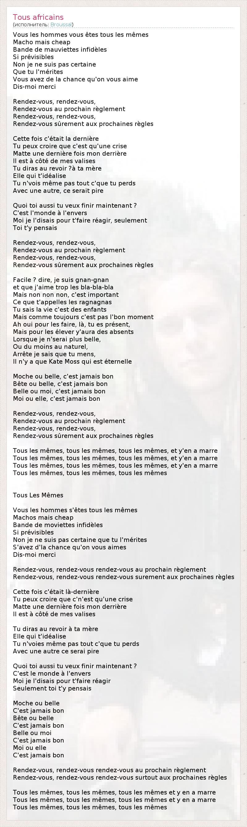 Vous les hommes vous êtes tous les mêmes Macho mais cheap Bande de mauviettes infidèles Si prévisibles Non je ne suis pas certaine Que tu l'mérites Vous avez de la chance qu'on vous aime Dis-moi merci Rendez-vous, rendez-vous, Rendez-vous au prochain règlement Rendez-vous, rendez-vous, Rendez-vous sûrement aux prochaines règles Cette fois c'était la dernière Tu peux croire que c'est qu'une crise Matte une dernière fois mon derrière Il est à côté de mes valises Tu diras au revoir ?à ta mère Elle qui t'idéalise Tu n'vois même pas tout c'que tu perds Avec une autre, ce serait pire Quoi toi aussi tu veux finir maintenant ? C'est l'monde à l'envers Moi je l'disais pour t'faire réagir, seulement Toi t'y pensais Rendez-vous, rendez-vous, Rendez-vous au prochain règlement Rendez-vous, rendez-vous, Rendez-vous sûrement aux prochaines règles Facile ? dire, je suis gnan-gnan et que j'aime trop les bla-bla-bla Mais non non non, c'est important Ce que t'appelles les ragnagnas Tu sais la vie c'est des enfants Mais comme toujours c'est pas l'bon moment Ah oui pour les faire, là, tu es présent, Mais pour les élever y'aura des absents Lorsque je n'serai plus belle, Ou du moins au naturel, Arrête je sais que tu mens, Il n'y a que Kate Moss qui est éternelle Moche ou belle, c'est jamais bon Bête ou belle, c'est jamais bon Belle ou moi, c'est jamais bon Moi ou elle, c'est jamais bon Rendez-vous, rendez-vous, Rendez-vous au prochain règlement Rendez-vous, rendez-vous, Rendez-vous sûrement aux prochaines règles Tous les mêmes, tous les mêmes, tous les mêmes, et y'en a marre Tous les mêmes, tous les mêmes, tous les mêmes, et y'en a marre Tous les mêmes, tous les mêmes, tous les mêmes, et y'en a marre Tous les mêmes, tous les mêmes, tous les mêmes Tous Les Mêmes Vous les hommes s'êtes tous les mêmes Machos mais cheap Bande de moviettes infidèles Si prévisibles Non je ne suis pas certaine que tu l'mérites S'avez d'la chance qu'on vous aimes Dis-moi merci Rendez-vous, rendez-vous rendez-vous au prochain règlement Rendez-vous, rendez-vous rendez-vous surement aux prochaines règles Cette fois c'était là-dernière Tu peux croire que c'n'est qu'une crise Matte une dernière fois mon derrière Il est à côté de mes valises Tu diras au revoir à ta mère Elle qui t'idéalise Tu n'voies même pas tout c'que tu perds Avec une autre ce serai pire Quoi toi aussi tu veux finir maintenant ? C'est le monde à l'envers Moi je l'disais pour t'faire réagir Seulement toi t'y pensais Moche ou belle C'est jamais bon Bête ou belle C'est jamais bon Belle ou moi C'est jamais bon Moi ou elle C'est jamais bon Rendez-vous, rendez-vous rendez-vous au prochain règlement Rendez-vous, rendez-vous rendez-vous surtout aux prochaines règles Tous les mêmes, tous les mêmes, tous les mêmes et y en a marre Tous les mêmes, tous les mêmes, tous les mêmes et y en a marre Tous les mêmes, tous les mêmes, tous les mêmes