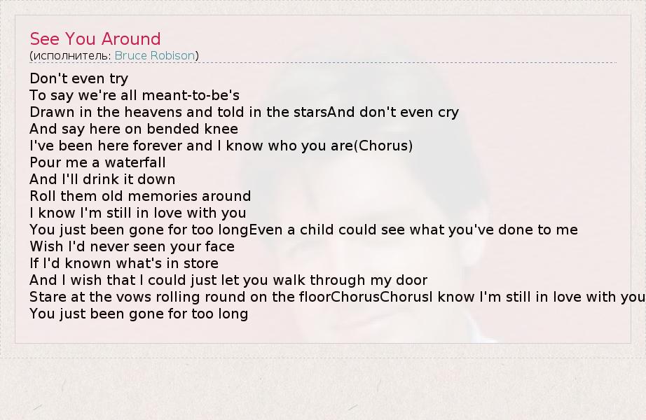 Don't even try To say we're all meant-to-be's Drawn in the heavens and told in the starsAnd don't even cry And say here on bended knee I've been here forever and I know who you are(Chorus) Pour me a waterfall And I'll drink it down Roll them old memories around I know I'm still in love with you You just been gone for too longEven a child could see what you've done to me Wish I'd never seen your face If I'd known what's in store And I wish that I could just let you walk through my door Stare at the vows rolling round on the floorChorusChorusI know I'm still in love with you You just been gone for too long