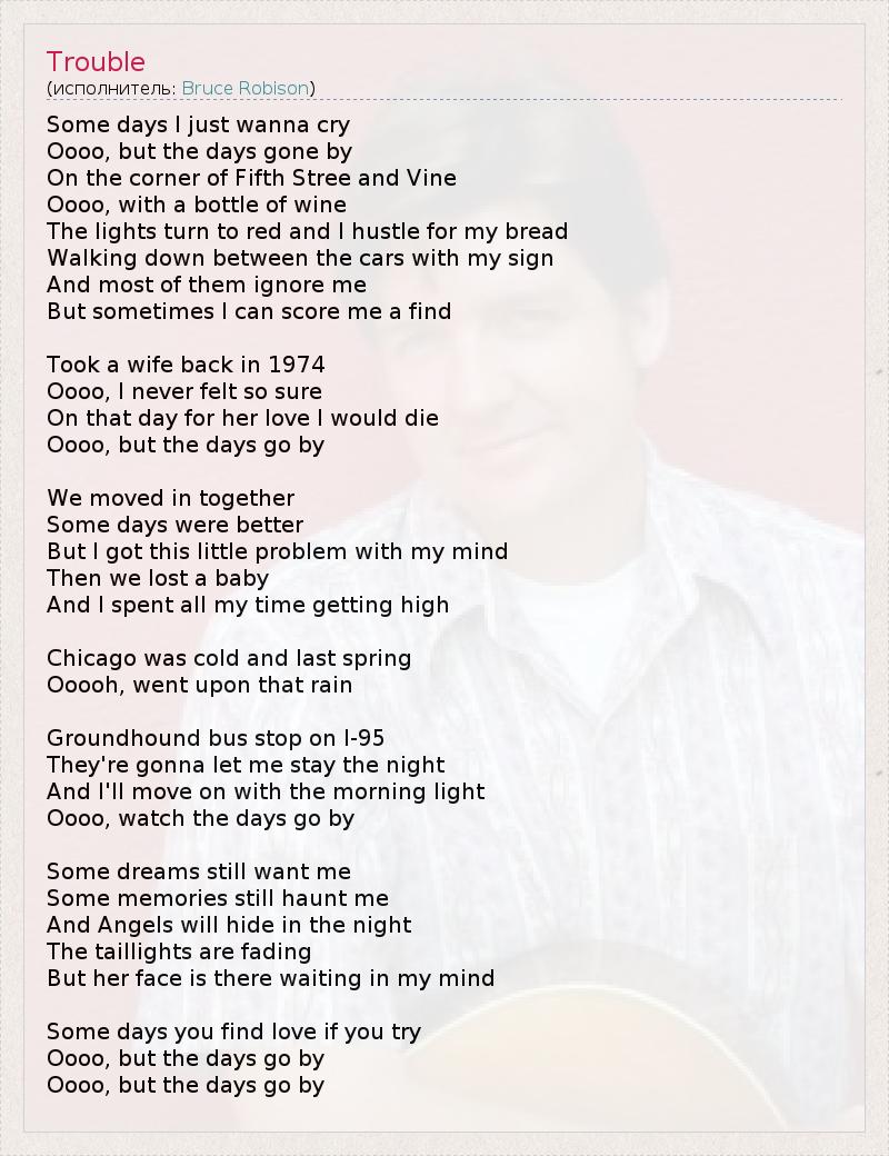 Some days I just wanna cry Oooo, but the days gone by On the corner of Fifth Stree and Vine Oooo, with a bottle of wine The lights turn to red and I hustle for my bread Walking down between the cars with my sign And most of them ignore me But sometimes I can score me a find Took a wife back in 1974 Oooo, I never felt so sure On that day for her love I would die Oooo, but the days go by We moved in together Some days were better But I got this little problem with my mind Then we lost a baby And I spent all my time getting high Chicago was cold and last spring Ooooh, went upon that rain Groundhound bus stop on I-95 They're gonna let me stay the night And I'll move on with the morning light Oooo, watch the days go by Some dreams still want me Some memories still haunt me And Angels will hide in the night The taillights are fading But her face is there waiting in my mind Some days you find love if you try Oooo, but the days go by Oooo, but the days go by
