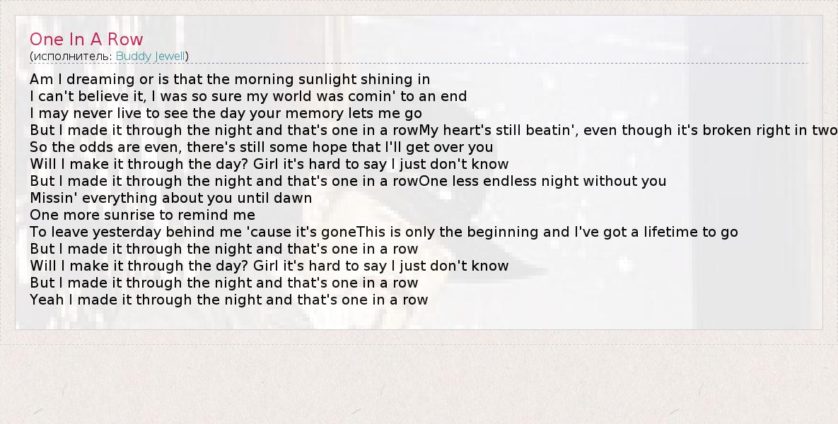 Am I dreaming or is that the morning sunlight shining in I can't believe it, I was so sure my world was comin' to an end I may never live to see the day your memory lets me go But I made it through the night and that's one in a rowMy heart's still beatin', even though it's broken right in two So the odds are even, there's still some hope that I'll get over you Will I make it through the day? Girl it's hard to say I just don't know But I made it through the night and that's one in a rowOne less endless night without you Missin' everything about you until dawn One more sunrise to remind me To leave yesterday behind me 'cause it's goneThis is only the beginning and I've got a lifetime to go But I made it through the night and that's one in a row Will I make it through the day? Girl it's hard to say I just don't know But I made it through the night and that's one in a row Yeah I made it through the night and that's one in a row