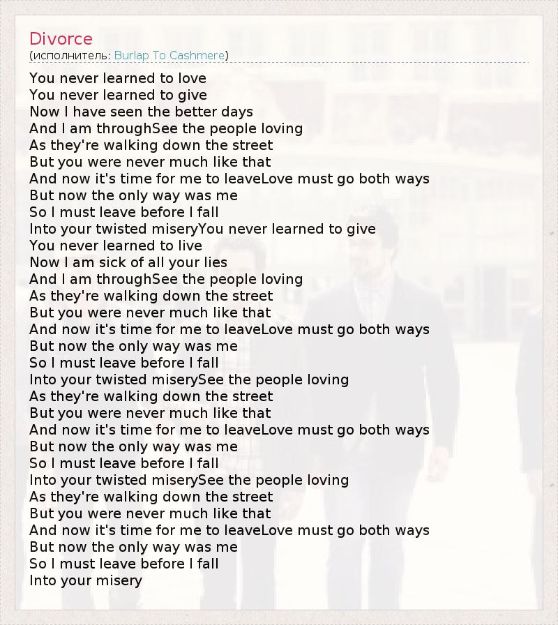 You never learned to love You never learned to give Now I have seen the better days And I am throughSee the people loving As they're walking down the street But you were never much like that And now it's time for me to leaveLove must go both ways But now the only way was me So I must leave before I fall Into your twisted miseryYou never learned to give You never learned to live Now I am sick of all your lies And I am throughSee the people loving As they're walking down the street But you were never much like that And now it's time for me to leaveLove must go both ways But now the only way was me So I must leave before I fall Into your twisted miserySee the people loving As they're walking down the street But you were never much like that And now it's time for me to leaveLove must go both ways But now the only way was me So I must leave before I fall Into your twisted miserySee the people loving As they're walking down the street But you were never much like that And now it's time for me to leaveLove must go both ways But now the only way was me So I must leave before I fall Into your misery