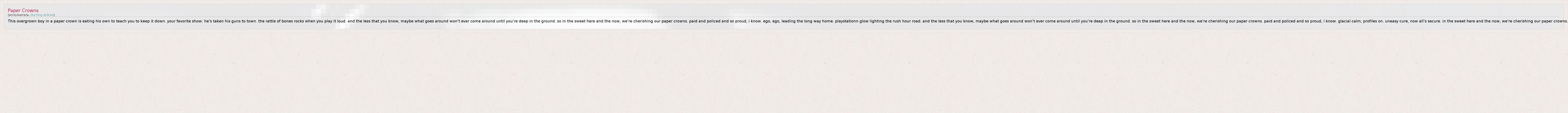 This overgrown boy in a paper crown is eating his own to teach you to keep it down. your favorite show: he's taken his guns to town. the rattle of bones rocks when you play it loud. and the less that you know, maybe what goes around won't ever come around until you're deep in the ground. so in the sweet here and the now, we're cherishing our paper crowns. paid and policed and so proud, i know. ego, ego, leading the long way home. playstationn glow lighting the rush hour road. and the less that you know, maybe what goes around won't ever come around until you're deep in the ground. so in the sweet here and the now, we're cherishing our paper crowns. paid and policed and so proud, i know. glacial calm, profiles on. uneasy cure, now all's secure. in the sweet here and the now, we're cherishing our paper crowns.