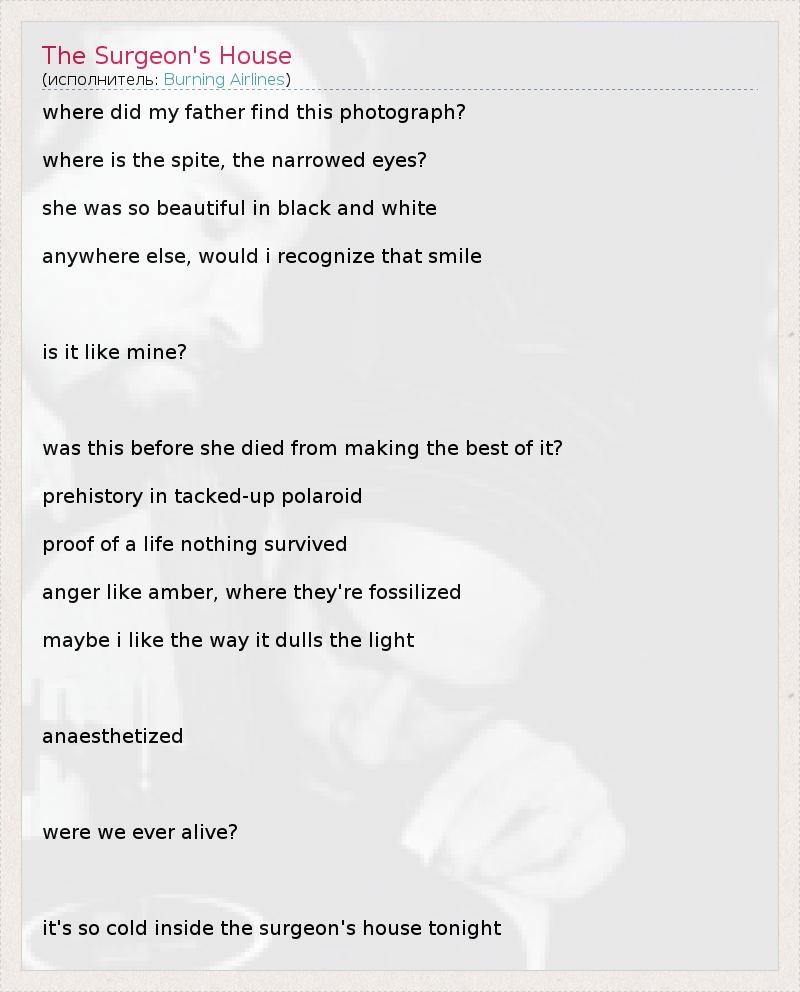 А как ты думаешь, о чем песня "The Surgeon's House" ?