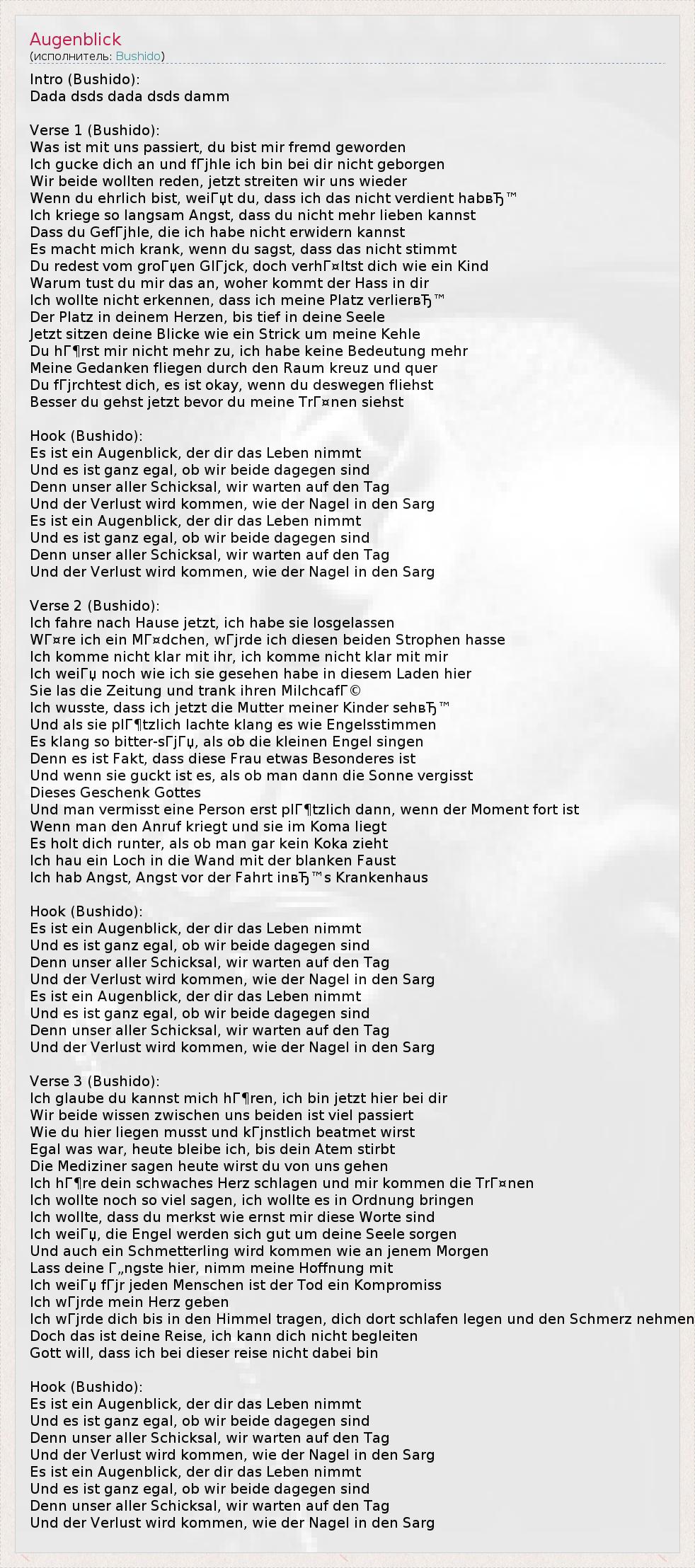 Intro (Bushido): Dada dsds dada dsds damm Verse 1 (Bushido): Was ist mit uns passiert, du bist mir fremd geworden Ich gucke dich an und fühle ich bin bei dir nicht geborgen Wir beide wollten reden, jetzt streiten wir uns wieder Wenn du ehrlich bist, weißt du, dass ich das nicht verdient hab’ Ich kriege so langsam Angst, dass du nicht mehr lieben kannst Dass du Gefühle, die ich habe nicht erwidern kannst Es macht mich krank, wenn du sagst, dass das nicht stimmt Du redest vom großen Glück, doch verhältst dich wie ein Kind Warum tust du mir das an, woher kommt der Hass in dir Ich wollte nicht erkennen, dass ich meine Platz verlier’ Der Platz in deinem Herzen, bis tief in deine Seele Jetzt sitzen deine Blicke wie ein Strick um meine Kehle Du hörst mir nicht mehr zu, ich habe keine Bedeutung mehr Meine Gedanken fliegen durch den Raum kreuz und quer Du fürchtest dich, es ist okay, wenn du deswegen fliehst Besser du gehst jetzt bevor du meine Tränen siehst Hook (Bushido): Es ist ein Augenblick, der dir das Leben nimmt Und es ist ganz egal, ob wir beide dagegen sind Denn unser aller Schicksal, wir warten auf den Tag Und der Verlust wird kommen, wie der Nagel in den Sarg Es ist ein Augenblick, der dir das Leben nimmt Und es ist ganz egal, ob wir beide dagegen sind Denn unser aller Schicksal, wir warten auf den Tag Und der Verlust wird kommen, wie der Nagel in den Sarg Verse 2 (Bushido): Ich fahre nach Hause jetzt, ich habe sie losgelassen Wäre ich ein Mädchen, würde ich diesen beiden Strophen hasse Ich komme nicht klar mit ihr, ich komme nicht klar mit mir Ich weiß noch wie ich sie gesehen habe in diesem Laden hier Sie las die Zeitung und trank ihren Milchcafé Ich wusste, dass ich jetzt die Mutter meiner Kinder seh’ Und als sie plötzlich lachte klang es wie Engelsstimmen Es klang so bitter-süß, als ob die kleinen Engel singen Denn es ist Fakt, dass diese Frau etwas Besonderes ist Und wenn sie guckt ist es, als ob man dann die Sonne vergisst Dieses Geschenk Gottes Und man vermisst eine Person erst plötzlich dann, wenn der Moment fort ist Wenn man den Anruf kriegt und sie im Koma liegt Es holt dich runter, als ob man gar kein Koka zieht Ich hau ein Loch in die Wand mit der blanken Faust Ich hab Angst, Angst vor der Fahrt in’s Krankenhaus Hook (Bushido): Es ist ein Augenblick, der dir das Leben nimmt Und es ist ganz egal, ob wir beide dagegen sind Denn unser aller Schicksal, wir warten auf den Tag Und der Verlust wird kommen, wie der Nagel in den Sarg Es ist ein Augenblick, der dir das Leben nimmt Und es ist ganz egal, ob wir beide dagegen sind Denn unser aller Schicksal, wir warten auf den Tag Und der Verlust wird kommen, wie der Nagel in den Sarg Verse 3 (Bushido): Ich glaube du kannst mich hören, ich bin jetzt hier bei dir Wir beide wissen zwischen uns beiden ist viel passiert Wie du hier liegen musst und künstlich beatmet wirst Egal was war, heute bleibe ich, bis dein Atem stirbt Die Mediziner sagen heute wirst du von uns gehen Ich höre dein schwaches Herz schlagen und mir kommen die Tränen Ich wollte noch so viel sagen, ich wollte es in Ordnung bringen Ich wollte, dass du merkst wie ernst mir diese Worte sind Ich weiß, die Engel werden sich gut um deine Seele sorgen Und auch ein Schmetterling wird kommen wie an jenem Morgen Lass deine Ängste hier, nimm meine Hoffnung mit Ich weiß für jeden Menschen ist der Tod ein Kompromiss Ich würde mein Herz geben Ich würde dich bis in den Himmel tragen, dich dort schlafen legen und den Schmerz nehmen Doch das ist deine Reise, ich kann dich nicht begleiten Gott will, dass ich bei dieser reise nicht dabei bin Hook (Bushido): Es ist ein Augenblick, der dir das Leben nimmt Und es ist ganz egal, ob wir beide dagegen sind Denn unser aller Schicksal, wir warten auf den Tag Und der Verlust wird kommen, wie der Nagel in den Sarg Es ist ein Augenblick, der dir das Leben nimmt Und es ist ganz egal, ob wir beide dagegen sind Denn unser aller Schicksal, wir warten auf den Tag Und der Verlust wird kommen, wie der Nagel in den Sarg