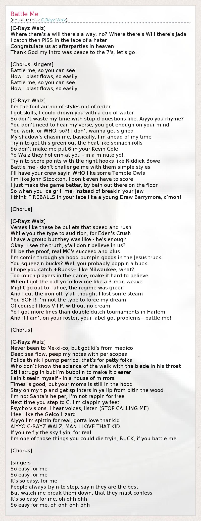 Это интересно:C-Rayz, он же Waleed Shabazz – афро-американец, родившийся и по сей день живущий в Бронксе. Сейчас он вполне серьезный человек, хороший артист, и любящий семьянин, но когда-то всё было совсем по другому. Отца C-Rayz-а убили, когда мальчику было 2 года, и все тяготы по воспитанию ребенка легли на его мать, которая трудилась день и ночь, чтобы прокормить себя и своего сына. Сидеть целыми днями дома ему было... продолжение