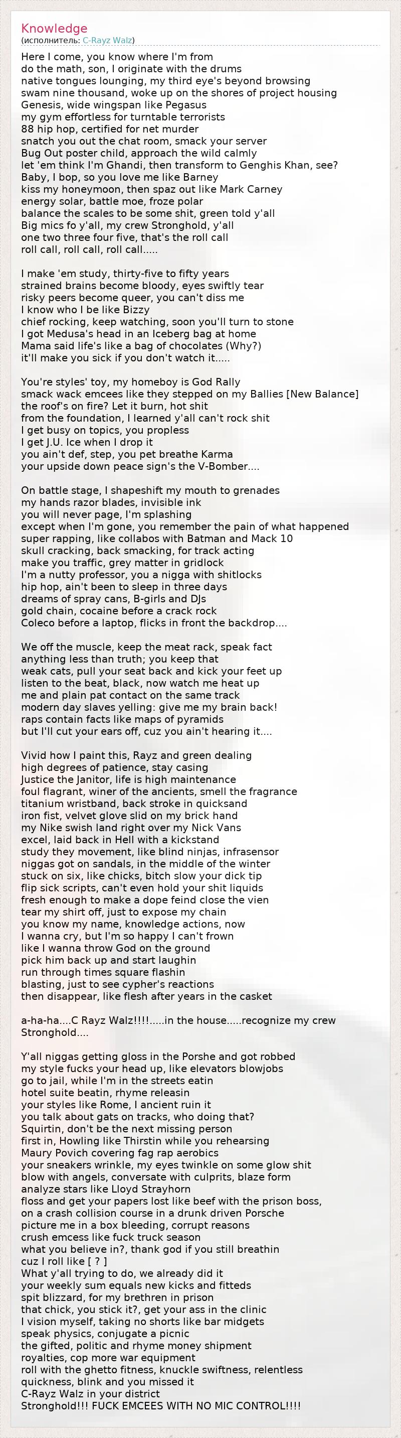 Это интересно:C-Rayz, он же Waleed Shabazz – афро-американец, родившийся и по сей день живущий в Бронксе. Сейчас он вполне серьезный человек, хороший артист, и любящий семьянин, но когда-то всё было совсем по другому. Отца C-Rayz-а убили, когда мальчику было 2 года, и все тяготы по воспитанию ребенка легли на его мать, которая трудилась день и ночь, чтобы прокормить себя и своего сына. Сидеть целыми днями дома ему было... продолжение
