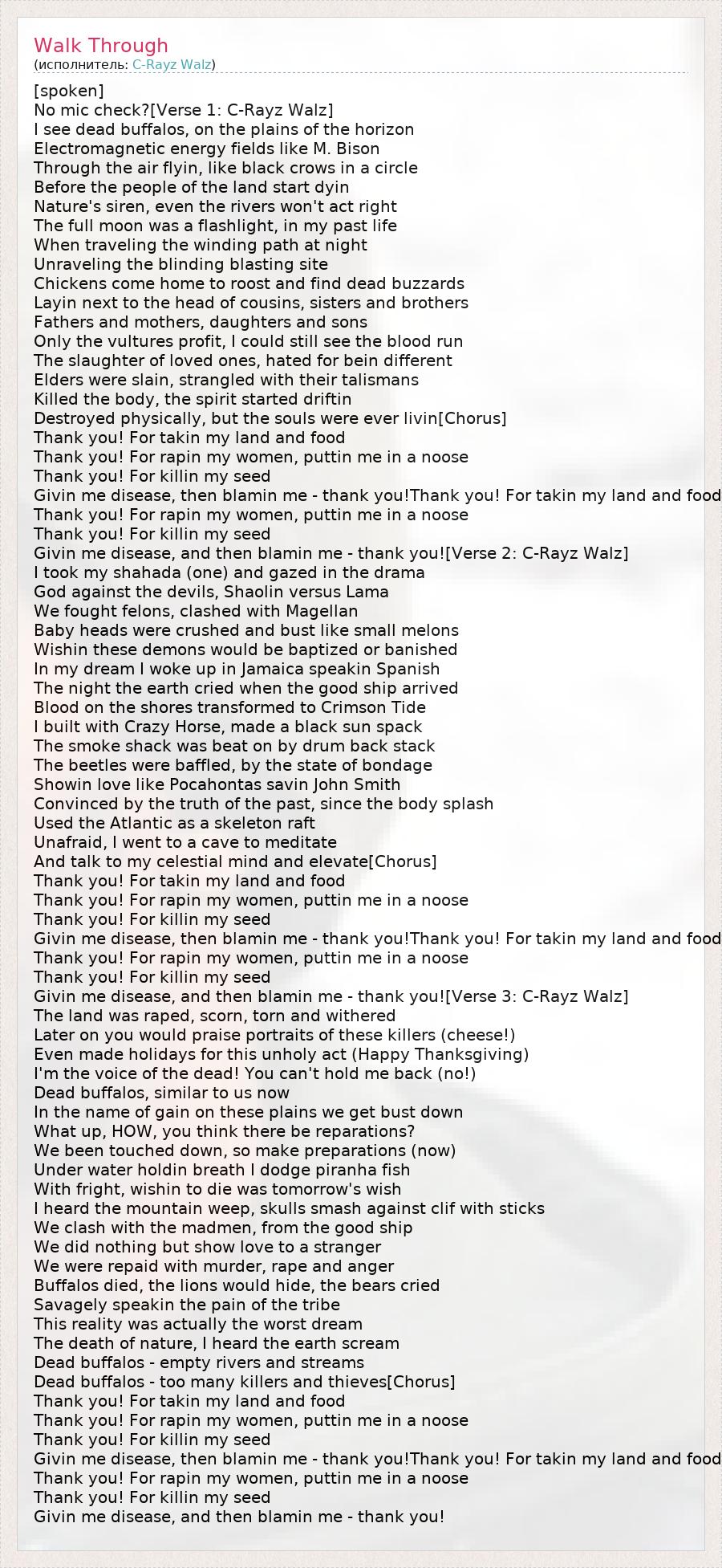 [spoken] No mic check?[Verse 1: C-Rayz Walz] I see dead buffalos, on the plains of the horizon Electromagnetic energy fields like M. Bison Through the air flyin, like black crows in a circle Before the people of the land start dyin Nature's siren, even the rivers won't act right The full moon was a flashlight, in my past life When traveling the winding path at night Unraveling the blinding blasting site Chickens come home to roost and find dead buzzards Layin next to the head of cousins, sisters and brothers Fathers and mothers, daughters and sons Only the vultures profit, I could still see the blood run The slaughter of loved ones, hated for bein different Elders were slain, strangled with their talismans Killed the body, the spirit started driftin Destroyed physically, but the souls were ever livin[Chorus] Thank you! For takin my land and food Thank you! For rapin my women, puttin me in a noose Thank you! For killin my seed Givin me disease, then blamin me - thank you!Thank you! For takin my land and food Thank you! For rapin my women, puttin me in a noose Thank you! For killin my seed Givin me disease, and then blamin me - thank you![Verse 2: C-Rayz Walz] I took my shahada (one) and gazed in the drama God against the devils, Shaolin versus Lama We fought felons, clashed with Magellan Baby heads were crushed and bust like small melons Wishin these demons would be baptized or banished In my dream I woke up in Jamaica speakin Spanish The night the earth cried when the good ship arrived Blood on the shores transformed to Crimson Tide I built with Crazy Horse, made a black sun spack The smoke shack was beat on by drum back stack The beetles were baffled, by the state of bondage Showin love like Pocahontas savin John Smith Convinced by the truth of the past, since the body splash Used the Atlantic as a skeleton raft Unafraid, I went to a cave to meditate And talk to my celestial mind and elevate[Chorus] Thank you! For takin my land and food Thank you! For rapin my women, puttin me in a noose Thank you! For killin my seed Givin me disease, then blamin me - thank you!Thank you! For takin my land and food Thank you! For rapin my women, puttin me in a noose Thank you! For killin my seed Givin me disease, and then blamin me - thank you![Verse 3: C-Rayz Walz] The land was raped, scorn, torn and withered Later on you would praise portraits of these killers (cheese!) Even made holidays for this unholy act (Happy Thanksgiving) I'm the voice of the dead! You can't hold me back (no!) Dead buffalos, similar to us now In the name of gain on these plains we get bust down What up, HOW, you think there be reparations? We been touched down, so make preparations (now) Under water holdin breath I dodge piranha fish With fright, wishin to die was tomorrow's wish I heard the mountain weep, skulls smash against clif with sticks We clash with the madmen, from the good ship We did nothing but show love to a stranger We were repaid with murder, rape and anger Buffalos died, the lions would hide, the bears cried Savagely speakin the pain of the tribe This reality was actually the worst dream The death of nature, I heard the earth scream Dead buffalos - empty rivers and streams Dead buffalos - too many killers and thieves[Chorus] Thank you! For takin my land and food Thank you! For rapin my women, puttin me in a noose Thank you! For killin my seed Givin me disease, then blamin me - thank you!Thank you! For takin my land and food Thank you! For rapin my women, puttin me in a noose Thank you! For killin my seed Givin me disease, and then blamin me - thank you!