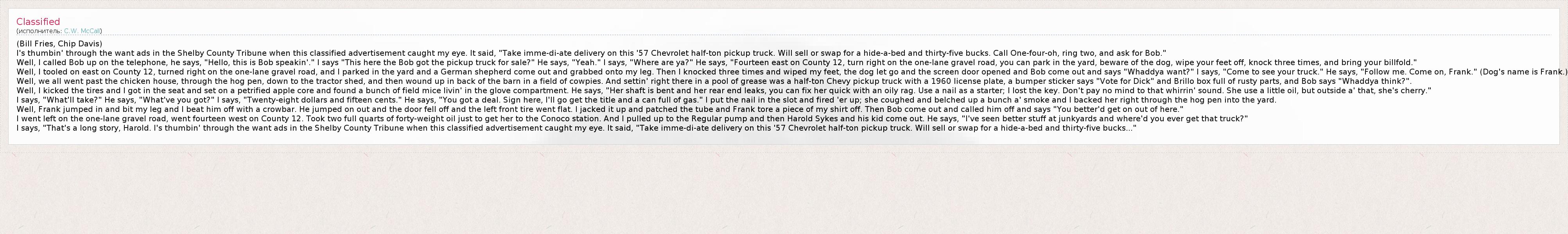 (Bill Fries, Chip Davis) I's thumbin' through the want ads in the Shelby County Tribune when this classified advertisement caught my eye. It said, "Take imme-di-ate delivery on this '57 Chevrolet half-ton pickup truck. Will sell or swap for a hide-a-bed and thirty-five bucks. Call One-four-oh, ring two, and ask for Bob." Well, I called Bob up on the telephone, he says, "Hello, this is Bob speakin'." I says "This here the Bob got the pickup truck for sale?" He says, "Yeah." I says, "Where are ya?" He says, "Fourteen east on County 12, turn right on the one-lane gravel road, you can park in the yard, beware of the dog, wipe your feet off, knock three times, and bring your billfold." Well, I tooled on east on County 12, turned right on the one-lane gravel road, and I parked in the yard and a German shepherd come out and grabbed onto my leg. Then I knocked three times and wiped my feet, the dog let go and the screen door opened and Bob come out and says "Whaddya want?" I says, "Come to see your truck." He says, "Follow me. Come on, Frank." (Dog's name is Frank.) Well, we all went past the chicken house, through the hog pen, down to the tractor shed, and then wound up in back of the barn in a field of cowpies. And settin' right there in a pool of grease was a half-ton Chevy pickup truck with a 1960 license plate, a bumper sticker says "Vote for Dick" and Brillo box full of rusty parts, and Bob says "Whaddya think?". Well, I kicked the tires and I got in the seat and set on a petrified apple core and found a bunch of field mice livin' in the glove compartment. He says, "Her shaft is bent and her rear end leaks, you can fix her quick with an oily rag. Use a nail as a starter; I lost the key. Don't pay no mind to that whirrin' sound. She use a little oil, but outside a' that, she's cherry." I says, "What'll take?" He says, "What've you got?" I says, "Twenty-eight dollars and fifteen cents." He says, "You got a deal. Sign here, I'll go get the title and a can full of gas." I put the nail in the slot and fired 'er up; she coughed and belched up a bunch a' smoke and I backed her right through the hog pen into the yard. Well, Frank jumped in and bit my leg and I beat him off with a crowbar. He jumped on out and the door fell off and the left front tire went flat. I jacked it up and patched the tube and Frank tore a piece of my shirt off. Then Bob come out and called him off and says "You better'd get on out of here." I went left on the one-lane gravel road, went fourteen west on County 12. Took two full quarts of forty-weight oil just to get her to the Conoco station. And I pulled up to the Regular pump and then Harold Sykes and his kid come out. He says, "I've seen better stuff at junkyards and where'd you ever get that truck?" I says, "That's a long story, Harold. I's thumbin' through the want ads in the Shelby County Tribune when this classified advertisement caught my eye. It said, "Take imme-di-ate delivery on this '57 Chevrolet half-ton pickup truck. Will sell or swap for a hide-a-bed and thirty-five bucks..."