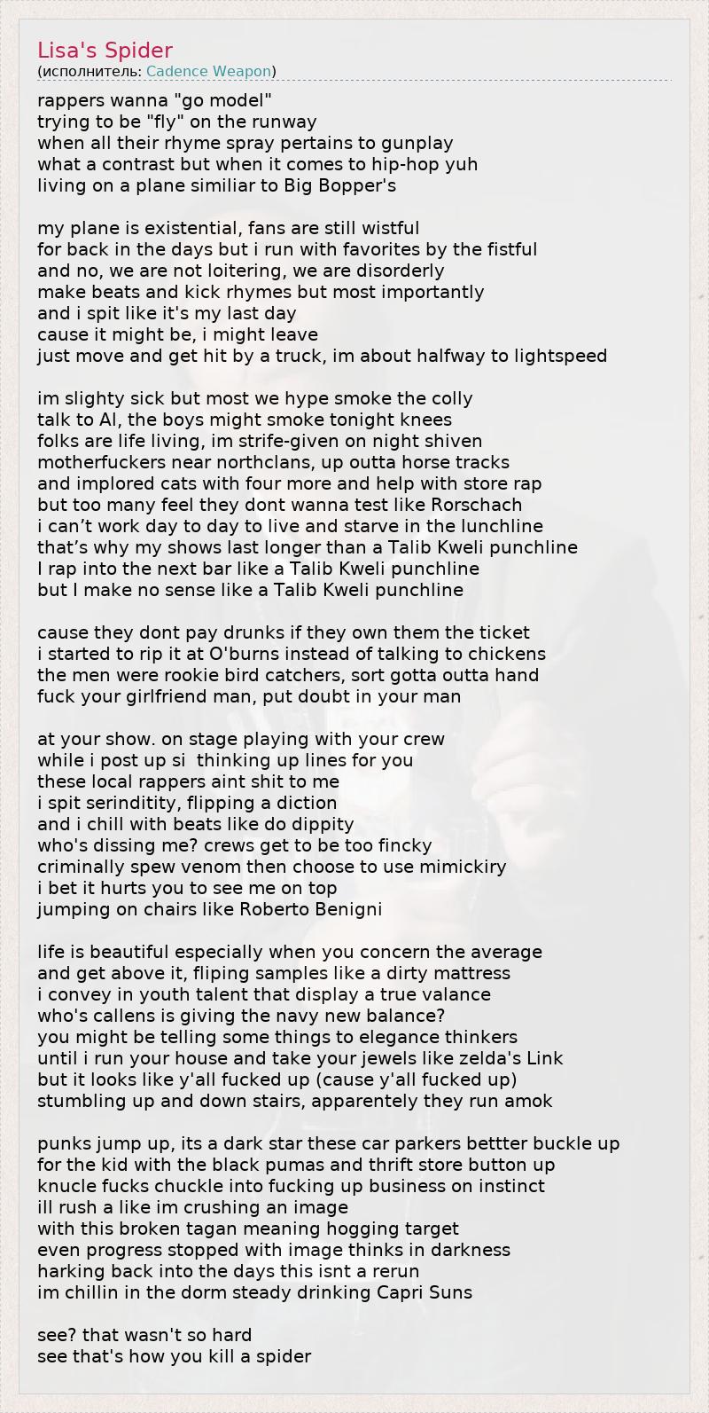 А как ты думаешь, о чем песня "Lisa's Spider" ?