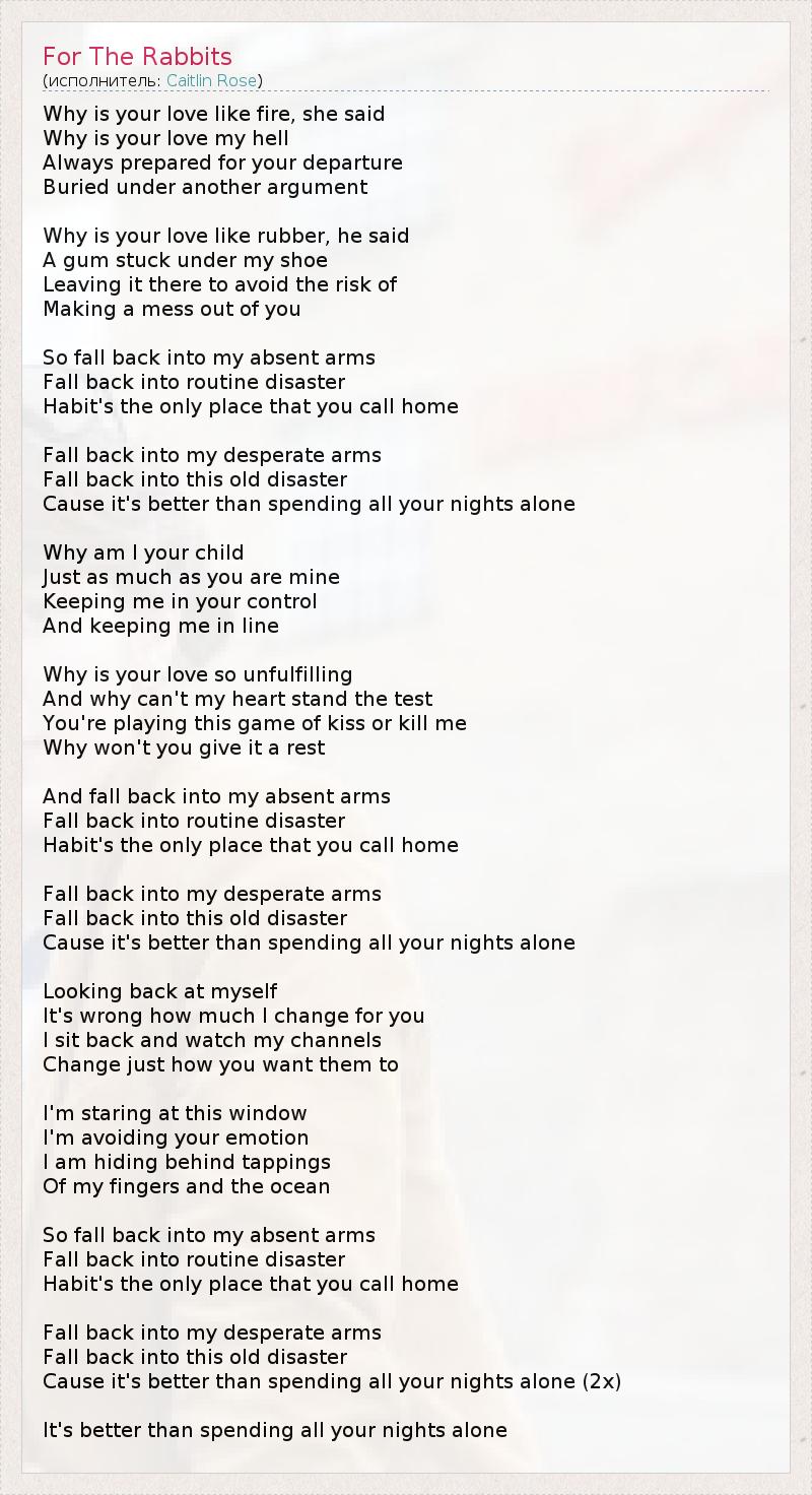 Why is your love like fire, she said Why is your love my hell Always prepared for your departure Buried under another argument Why is your love like rubber, he said A gum stuck under my shoe Leaving it there to avoid the risk of Making a mess out of you So fall back into my absent arms Fall back into routine disaster Habit's the only place that you call home Fall back into my desperate arms Fall back into this old disaster Cause it's better than spending all your nights alone Why am I your child Just as much as you are mine Keeping me in your control And keeping me in line Why is your love so unfulfilling And why can't my heart stand the test You're playing this game of kiss or kill me Why won't you give it a rest And fall back into my absent arms Fall back into routine disaster Habit's the only place that you call home Fall back into my desperate arms Fall back into this old disaster Cause it's better than spending all your nights alone Looking back at myself It's wrong how much I change for you I sit back and watch my channels Change just how you want them to I'm staring at this window I'm avoiding your emotion I am hiding behind tappings Of my fingers and the ocean So fall back into my absent arms Fall back into routine disaster Habit's the only place that you call home Fall back into my desperate arms Fall back into this old disaster Cause it's better than spending all your nights alone (2x) It's better than spending all your nights alone