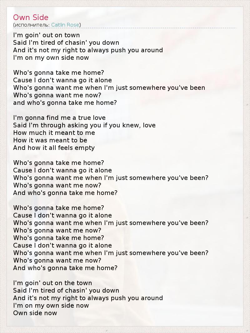 I'm goin' out on town Said I'm tired of chasin' you down And it's not my right to always push you around I'm on my own side now Who's gonna take me home? Cause I don't wanna go it alone Who's gonna want me when I'm just somewhere you've been Who's gonna want me now? and who's gonna take me home? I'm gonna find me a true love Said I'm through asking you if you knew, love How much it meant to me How it was meant to be And how it all feels empty Who's gonna take me home? Cause I don't wanna go it alone Who's gonna want me when I'm just somewhere you've been? Who's gonna want me now? And who's gonna take me home? Who's gonna take me home? Cause I don't wanna go it alone Who's gonna want me when I'm just somewhere you've been? Who's gonna want me now? Who's gonna take me home? Cause I don't wanna go it alone Who's gonna want me when I'm just somewhere you've been? Who's gonna want me now? And who's gonna take me home? I'm goin' out on the town Said I'm tired of chasin' you down And it's not my right to always push you around I'm on my own side now Own side now