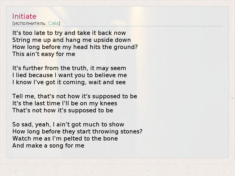 It's too late to try and take it back now String me up and hang me upside down How long before my head hits the ground? This ain't easy for me It's further from the truth, it may seem I lied because I want you to believe me I know I've got it coming, wait and see Tell me, that's not how it's supposed to be It's the last time I'll be on my knees That's not how it's supposed to be So sad, yeah, I ain't got much to show How long before they start throwing stones? Watch me as I'm pelted to the bone And make a song for me