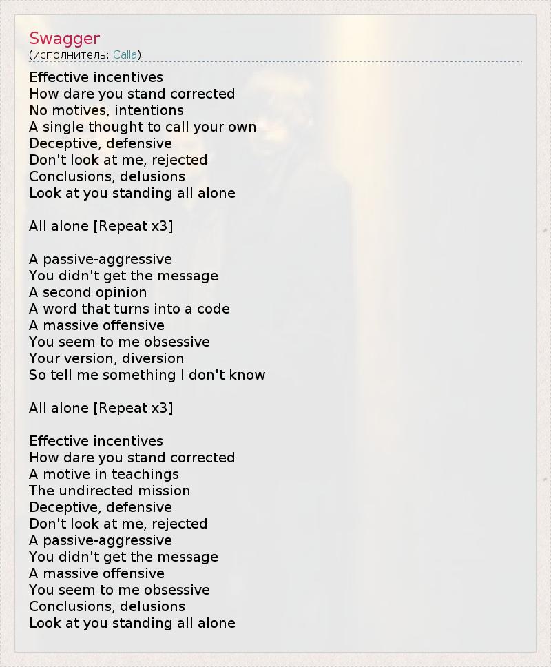 Effective incentives How dare you stand corrected No motives, intentions A single thought to call your own Deceptive, defensive Don't look at me, rejected Conclusions, delusions Look at you standing all alone All alone [Repeat x3] A passive-aggressive You didn't get the message A second opinion A word that turns into a code A massive offensive You seem to me obsessive Your version, diversion So tell me something I don't know All alone [Repeat x3] Effective incentives How dare you stand corrected A motive in teachings The undirected mission Deceptive, defensive Don't look at me, rejected A passive-aggressive You didn't get the message A massive offensive You seem to me obsessive Conclusions, delusions Look at you standing all alone
